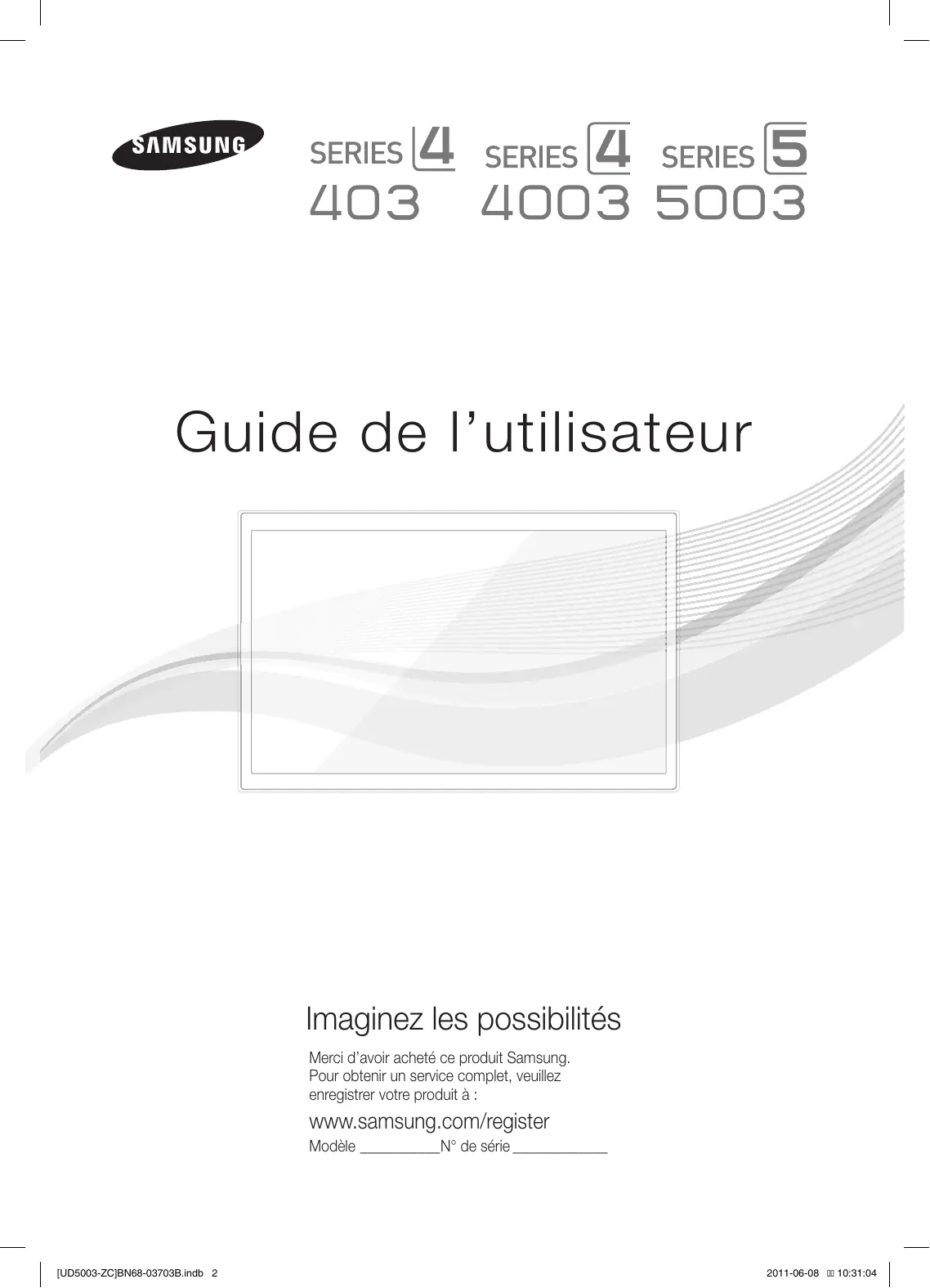 2011-06-08 10:31:03 Guide de l’utilisateur Imaginez les possibilités Merci d’avoir acheté ce produit Samsung. Pour obtenir un service complet, veuillez enregistrer votre produit à : www.samsung.com/register Modèle ___________N° de série _____________ [UD5003-ZC]BN68-03703B.indb 2 2011-06-08 10:31:04 Les figures et les illustrations de ce mode d’emploi ne sont fournies qu’à titre de référence. L’apparence réelle du produit pourrait être différente. Le design et les spécifications du produit peuvent être modifiés sans préavis. Remarques importantes sur la garantie relative au format de l'image du téléviseur ✎✎ Voir le bon de garantie pour avoir plus d'information sur les conditions de garantie. Le format écran large des écrans ACL/DEL (16:9, soit le rapport hauteur/largeur de l’image) est conçu principalement pour les vidéos plein écran à écran large. Les images affichées devraient être en format écran large 16:9 ou agrandi afin de remplir l'écran si votre modèle offre cette caractéristique et que les images sont constamment en mouvement. L'affichage de graphiques et d'images fixes, comme les barres noires des vidéos et des programmes de télévision en format standard non agrandi doit être limité au maximum à 5 % du temps d'écoute hebdomadaire. De plus, il faut limiter l’affichage d’images et de textes fixes, comme les rapports boursiers, les affichages de jeux vidéo, les logos des stations, les sites Web ou les images graphiques et les schémas des ordinateurs, tel qu'indiqué ci-dessus, et ce pour tous les téléviseurs. L'affichage d'images fixes qui ne respecte pas les directives ci-dessus peut causer un vieillissement inégal des écrans ACL/DEL en y créant des images fantômes subtiles mais permanentes. Pour éviter ce problème, faites varier les émissions et les images et regarder principalement des images plein écran en mouvement et non pas des images ou des barres foncées fixes. Dans les modèles d'écran à plasma qui offrent des caractéristiques de format d'image, utiliser ces commandes pour obtenir différents formats en plein écran. Prendre garde au choix des formats et à leur durée d'utilisation. Un vieillissement inégal résultant du choix et de l’utilisation d’un format, tout comme les images rémanentes, ne sont pas couverts par la garantie limitée de Samsung.
