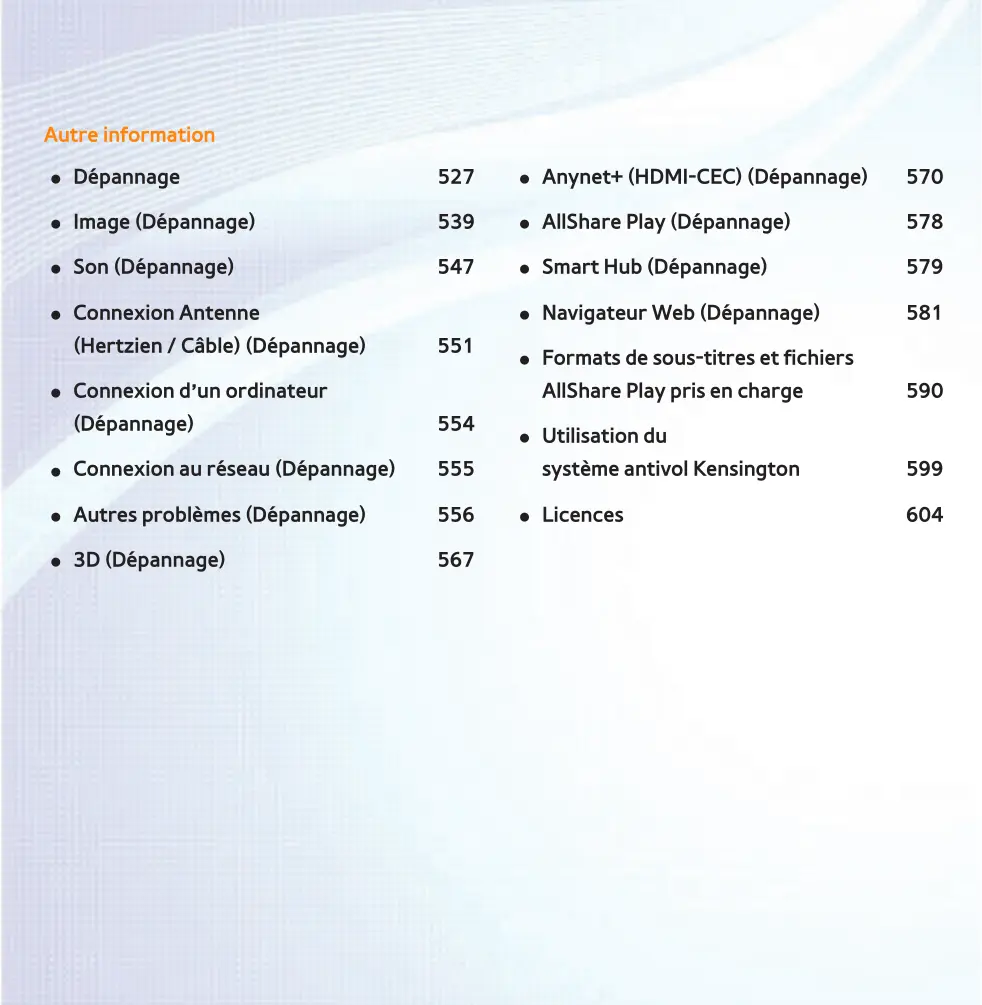 ●● Connexion d’un ordinateur (Dépannage) ●● Formats de sous-titres et fichiers AllShare Play pris en charge