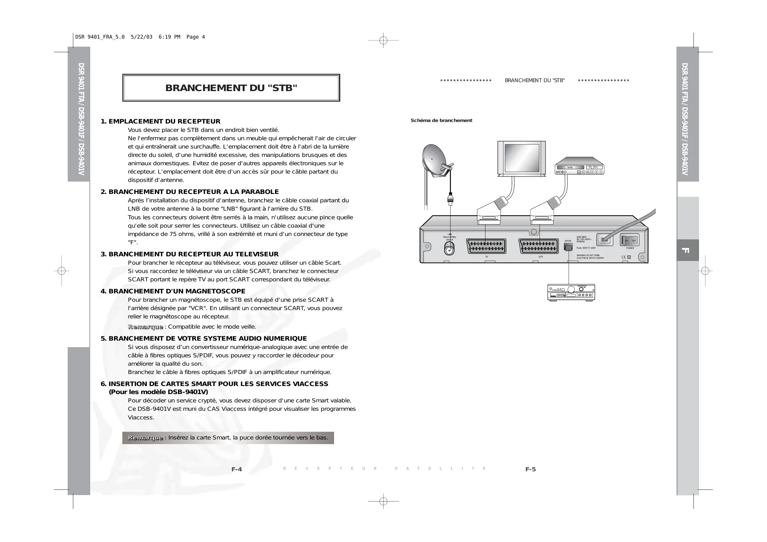 DSR 9401_FRA_5.0 5/22/03 6:19 PM Page IV Ce STB a été fabriqué conformément aux normes de sécurité internationales. Veuillez lire attentivement les recommandations de sécurité suivantes. ALIMENTATION SECTEUR : AC 100~240V 50/60Hz Evitez de surcharger les prises murales, les rallonges ou les adaptateurs, car il peut s'ensuivre un incendie ou une électrocution. LIQUIDES : Tenez les liquides à l'écart du STB NETTOYAGE : Avant de le nettoyer, déconnectez le STB de la prise murale. Utilisez un chiffon doux légèrement humecté d'eau (pas de solvants) pour nettoyer l'extérieur. AERATION : N'obstruez pas les orifices d'aération du STB. Vérifiez que la circulation d'air peut s'effectuer librement autour du STB. Ne placez jamais le STB dans un endroit exposé à la lumière directe du soleil ou à proximité d'une source de chaleur, un radiateur par exemple. N'empilez aucun autre appareil électronique sur le STB. Placez le STB au minimum à 30 mm du mur. FIXATIONS : N'utilisez aucune fixation non recommandée par le fabricant du produit, car elles peuvent comporter des risques et endommager l'appareil. BRANCHEMENT AU LNB DE LA PARABOLE SATELLITE : L’âme du câble de connexion du LNB présente une tension élevée. Il est donc recommandé de débrancher le STB de l'alimentation secteur avant de brancher ou de débrancher ce câble. DANS LE CAS CONTRAIRE, LE LNB RISQUE D'ETRE ENDOMMAGE. REPARATIONS : Ne tentez pas de réparer vous-même cet appareil. Toute tentative dans ce sens entraîne une annulation de la garantie. Confiez l'ensemble des réparations à un agent qualifié. FOUDRE : Si le STB est installé dans une zone à forte activité orageuse, il est indispensable de mettre en place des dispositifs de protection pour le branchement du STB au secteur ainsi que pour la ligne du téléphone et du modem. En cas d'orage, vous devez également respecter les consignes de chaque fabricant visant à protéger les autres appareils, tels le téléviseur, la chaîne hi-fi, etc., reliés au STB. MISE A LA TERRE : La masse du câble du LNB doit est reliée directement à la prise de masse du système de la parabole. L'installation de mise à la terre doit être conforme aux réglementations locales. R e m a rq u e : Jetez les batteries usagées dans un lieu prévu à cet effet de manière à protéger l'environnement. F-1