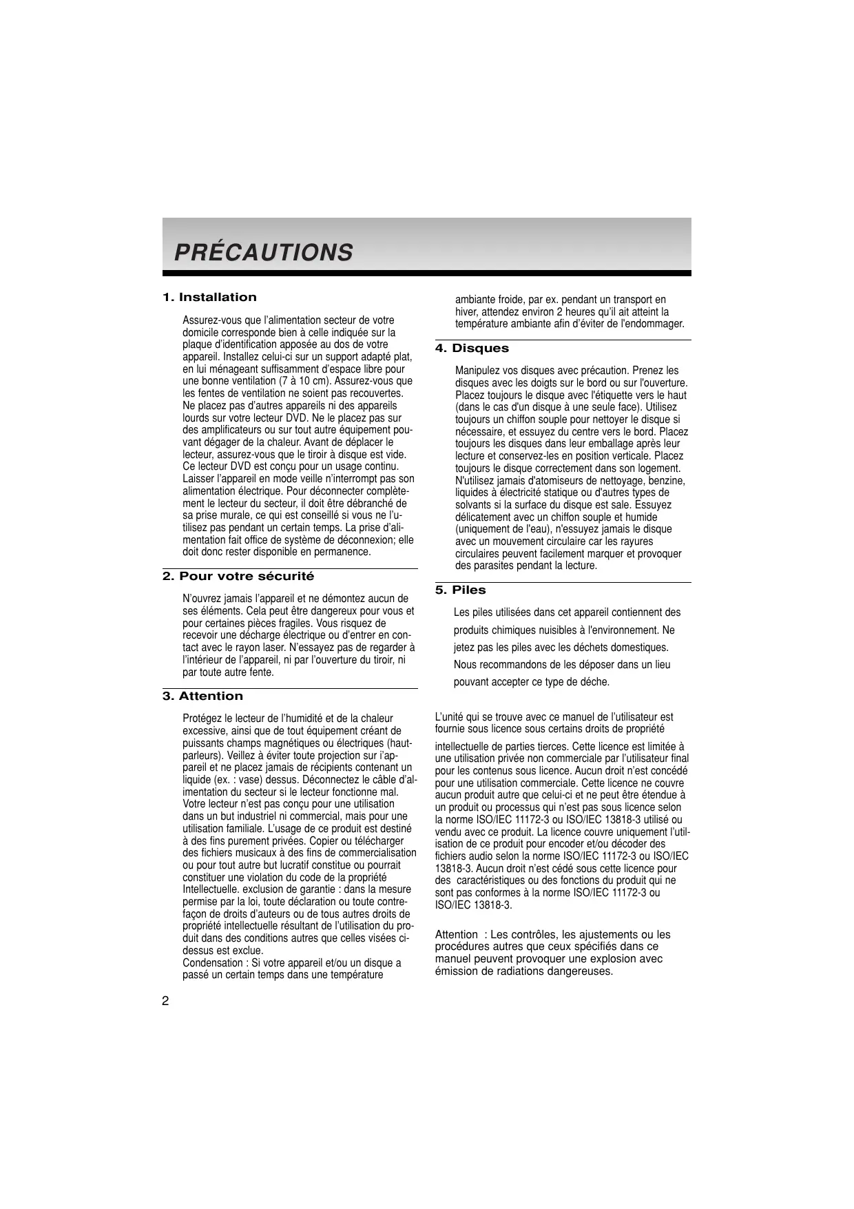 N’ouvrez jamais l’appareil et ne démontez aucun de ses éléments. Cela peut être dangereux pour vous et pour certaines pièces fragiles. Vous risquez de recevoir une décharge électrique ou d’entrer en contact avec le rayon laser. N’essayez pas de regarder à l’intérieur de l’appareil, ni par l’ouverture du tiroir, ni par toute autre fente. ambiante froide, par ex. pendant un transport en hiver, attendez environ 2 heures qu’il ait atteint la température ambiante afin d’éviter de l'endommager.