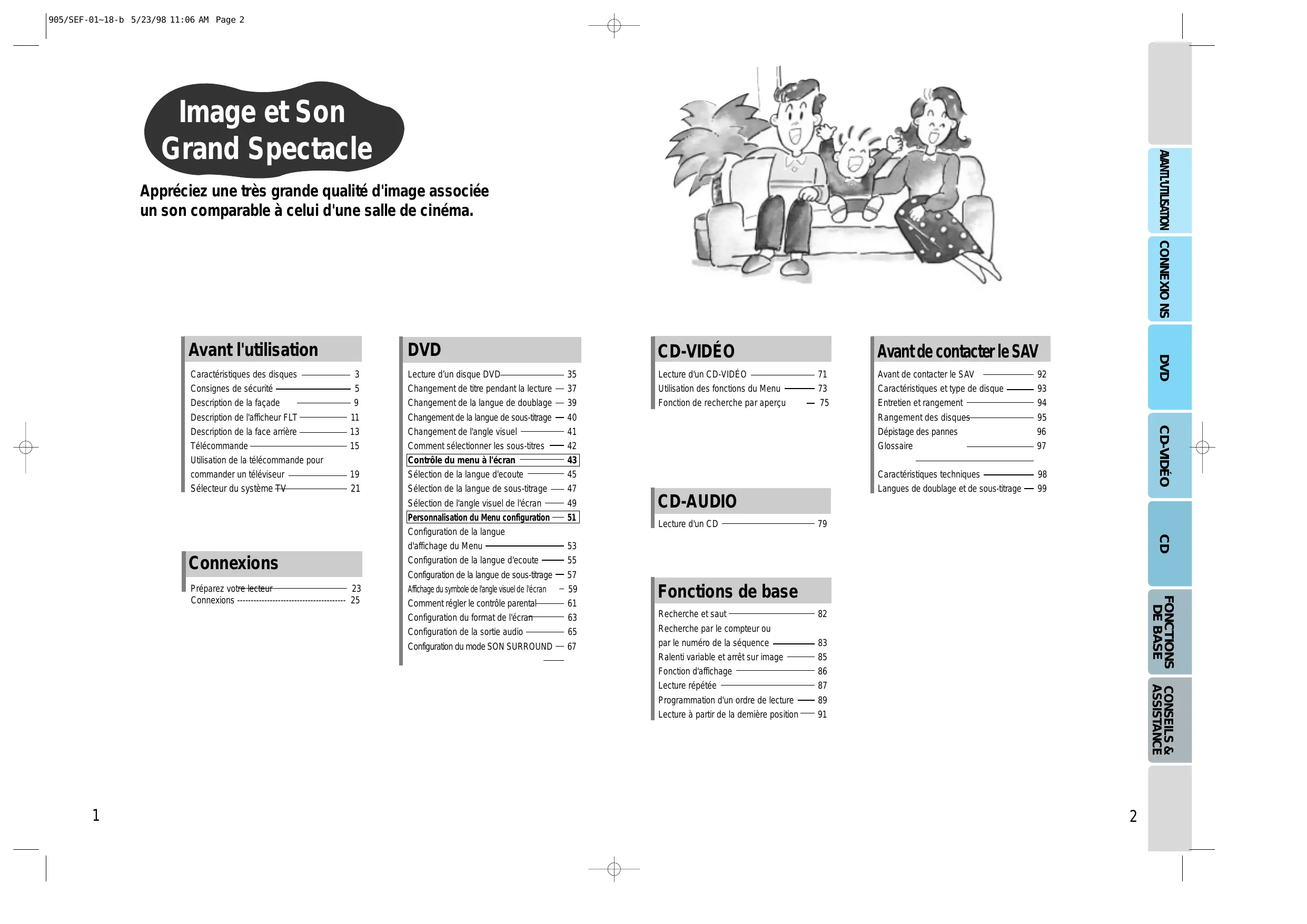 FONCTIONS DE BASE Préparez votre lecteur Connexions ---------------------------------------- 25 Lecture d’un disque DVD Changement de titre pendant la lecture Changement de la langue de doublage Changement de la langue de sous-titrage Changement de l'angle visuel Comment sélectionner les sous-titres Contrôle du menu à l'écran Sélection de la langue d'ecoute Sélection de la langue de sous-titrage Sélection de l'angle visuel de l'écran Personnalisation du Menu configuration Configuration de la langue d'affichage du Menu Avant de contacter le SAV