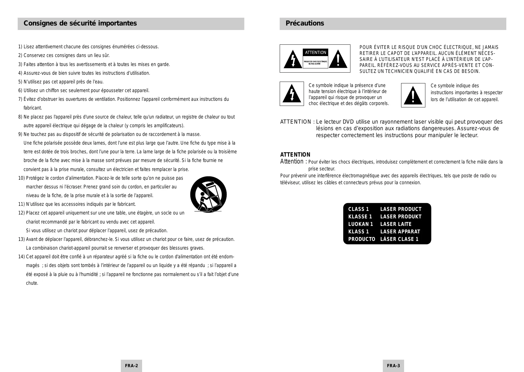 • La combinaison chariot-appareil pourrait se renverser et provoquer des blessures graves. 14) Cet appareil doit être confié à un réparateur agréé si la fiche ou le cordon d'alimentation ont été endommagés ; si des objets sont tombés à l’intérieur de l’appareil ou un liquide y a été répandu ; si l’appareil a été exposé à la pluie ou à l'humidité ; si l’appareil ne fonctionne pas normalement ou s’il a fait l’objet d’une chute. FRA-2 FRA-3 Précautions Avant de commencer ATTENTION Table des matières Présentation Accessoires Consignes de sécurité importantes p. 2