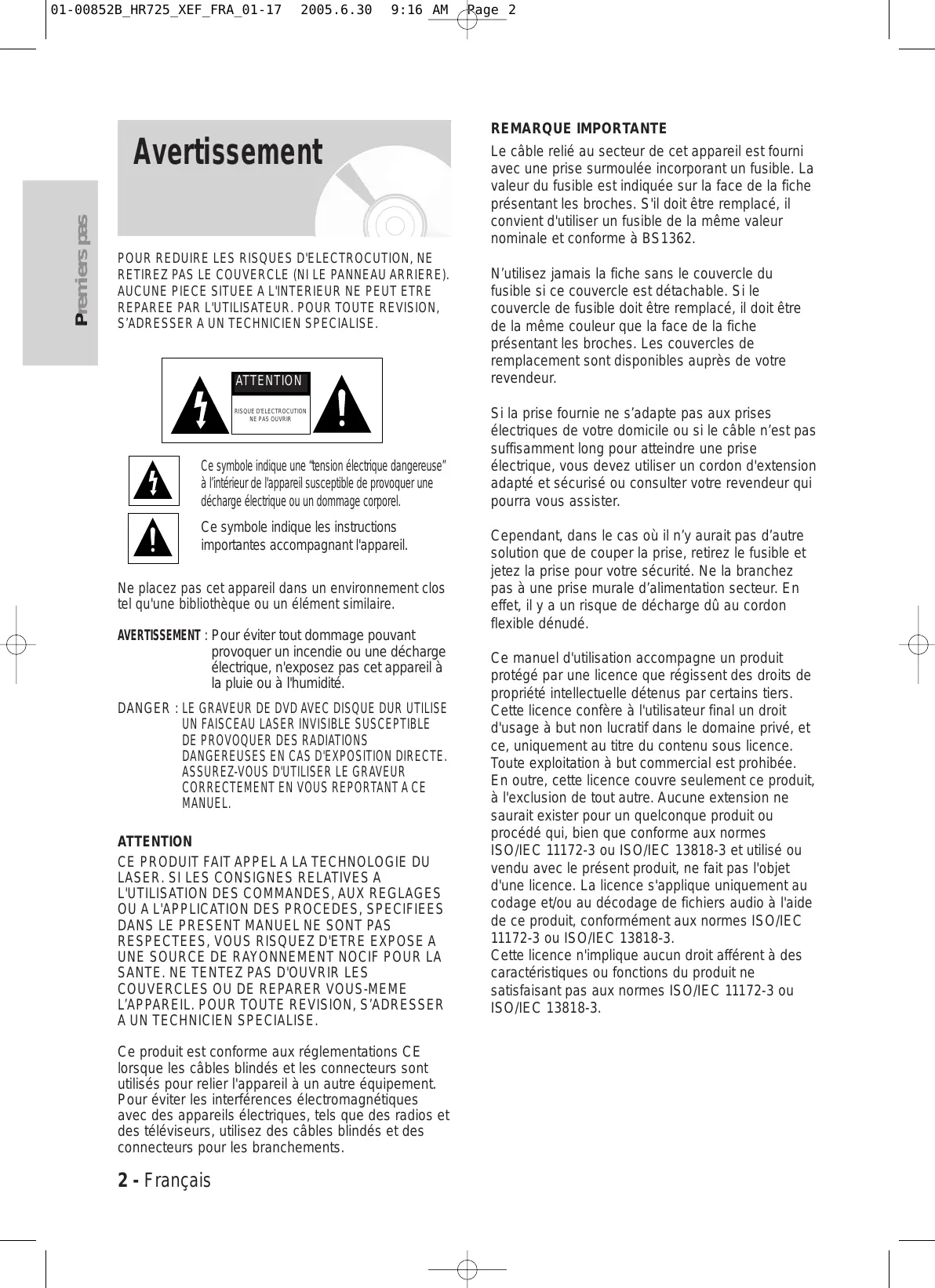 Le câble relié au secteur de cet appareil est fourni avec une prise surmoulée incorporant un fusible. La valeur du fusible est indiquée sur la face de la fiche présentant les broches. S'il doit être remplacé, il convient d'utiliser un fusible de la même valeur nominale et conforme à BS1362. N’utilisez jamais la fiche sans le couvercle du fusible si ce couvercle est détachable. Si le couvercle de fusible doit être remplacé, il doit être de la même couleur que la face de la fiche présentant les broches. Les couvercles de remplacement sont disponibles auprès de votre revendeur. Si la prise fournie ne s’adapte pas aux prises électriques de votre domicile ou si le câble n’est pas suffisamment long pour atteindre une prise électrique, vous devez utiliser un cordon d'extension adapté et sécurisé ou consulter votre revendeur qui pourra vous assister. Cependant, dans le cas où il n’y aurait pas d’autre solution que de couper la prise, retirez le fusible et jetez la prise pour votre sécurité. Ne la branchez pas à une prise murale d’alimentation secteur. En effet, il y a un risque de décharge dû au cordon flexible dénudé. Ce manuel d'utilisation accompagne un produit protégé par une licence que régissent des droits de propriété intellectuelle détenus par certains tiers. Cette licence confère à l'utilisateur final un droit d'usage à but non lucratif dans le domaine privé, et ce, uniquement au titre du contenu sous licence. Toute exploitation à but commercial est prohibée. En outre, cette licence couvre seulement ce produit, à l'exclusion de tout autre. Aucune extension ne saurait exister pour un quelconque produit ou procédé qui, bien que conforme aux normes ISO/IEC 11172-3 ou ISO/IEC 13818-3 et utilisé ou vendu avec le présent produit, ne fait pas l'objet d'une licence. La licence s'applique uniquement au codage et/ou au décodage de fichiers audio à l'aide de ce produit, conformément aux normes ISO/IEC 11172-3 ou ISO/IEC 13818-3. Cette licence n'implique aucun droit afférent à des caractéristiques ou fonctions du produit ne satisfaisant pas aux normes ISO/IEC 11172-3 ou ISO/IEC 13818-3.