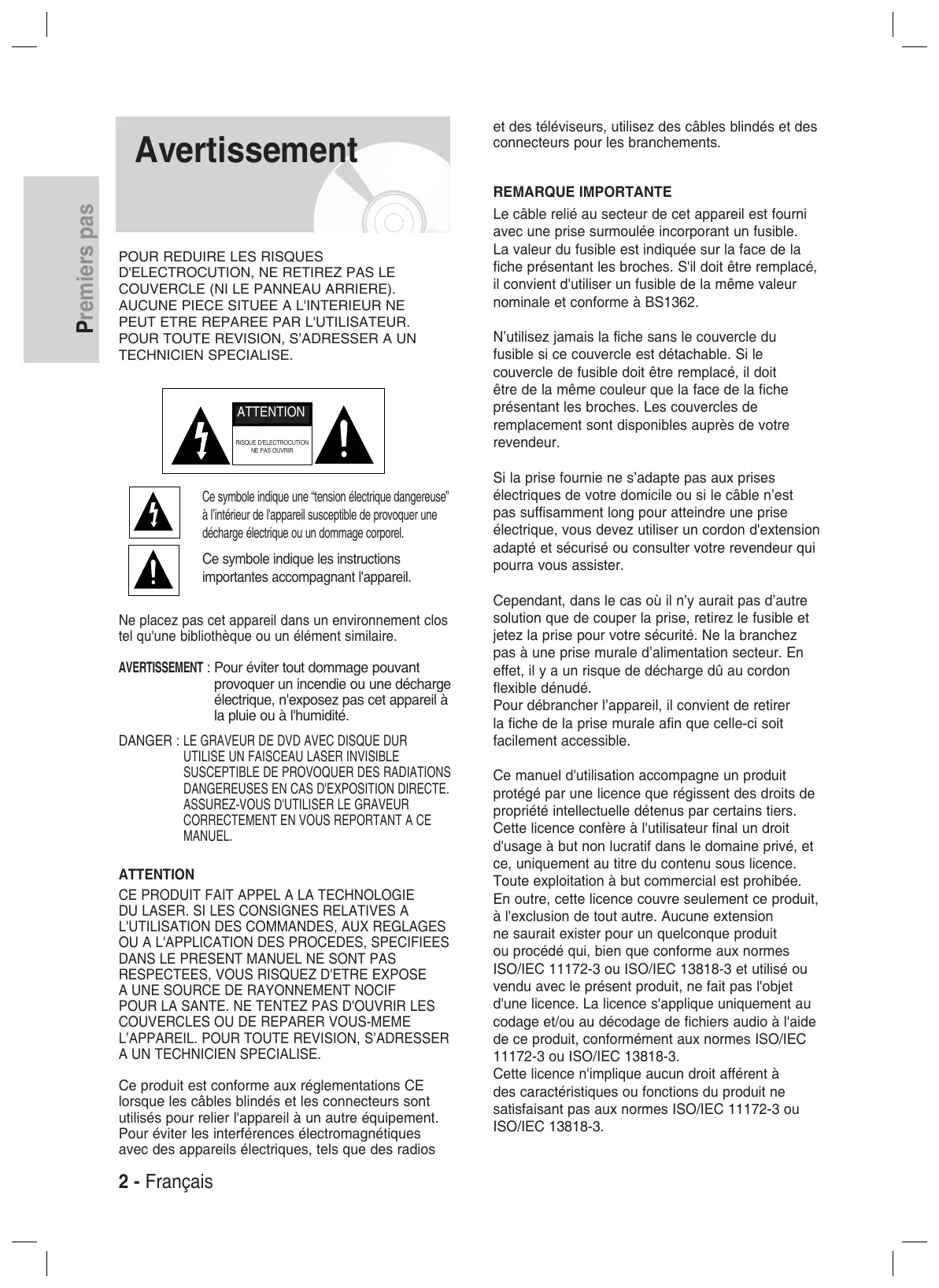 Le câble relié au secteur de cet appareil est fourni avec une prise surmoulée incorporant un fusible. La valeur du fusible est indiquée sur la face de la fiche présentant les broches. S'il doit être remplacé, il convient d'utiliser un fusible de la même valeur nominale et conforme à BS1362. N’utilisez jamais la fiche sans le couvercle du fusible si ce couvercle est détachable. Si le couvercle de fusible doit être remplacé, il doit être de la même couleur que la face de la fiche présentant les broches. Les couvercles de remplacement sont disponibles auprès de votre revendeur. Si la prise fournie ne s’adapte pas aux prises électriques de votre domicile ou si le câble n’est pas suffisamment long pour atteindre une prise électrique, vous devez utiliser un cordon d'extension adapté et sécurisé ou consulter votre revendeur qui pourra vous assister. Cependant, dans le cas où il n’y aurait pas d’autre solution que de couper la prise, retirez le fusible et jetez la prise pour votre sécurité. Ne la branchez pas à une prise murale d’alimentation secteur. En effet, il y a un risque de décharge dû au cordon flexible dénudé. Pour débrancher l’appareil, il convient de retirer la fiche de la prise murale afin que celle-ci soit facilement accessible. Ce manuel d'utilisation accompagne un produit protégé par une licence que régissent des droits de propriété intellectuelle détenus par certains tiers. Cette licence confère à l'utilisateur final un droit d'usage à but non lucratif dans le domaine privé, et ce, uniquement au titre du contenu sous licence. Toute exploitation à but commercial est prohibée. En outre, cette licence couvre seulement ce produit, à l'exclusion de tout autre. Aucune extension ne saurait exister pour un quelconque produit ou procédé qui, bien que conforme aux normes ISO/IEC 11172-3 ou ISO/IEC 13818-3 et utilisé ou vendu avec le présent produit, ne fait pas l'objet d'une licence. La licence s'applique uniquement au codage et/ou au décodage de fichiers audio à l'aide de ce produit, conformément aux normes ISO/IEC 11172-3 ou ISO/IEC 13818-3. Cette licence n'implique aucun droit afférent à des caractéristiques ou fonctions du produit ne satisfaisant pas aux normes ISO/IEC 11172-3 ou ISO/IEC 13818-3. Précautions Lisez attentivement ces instructions d'utilisation avant d'utiliser l'appareil. Conformez-vous à toutes les consignes de sécurité listées ci-dessous. Conservez ces instructions d'utilisation en vue d'une consultation ultérieure.