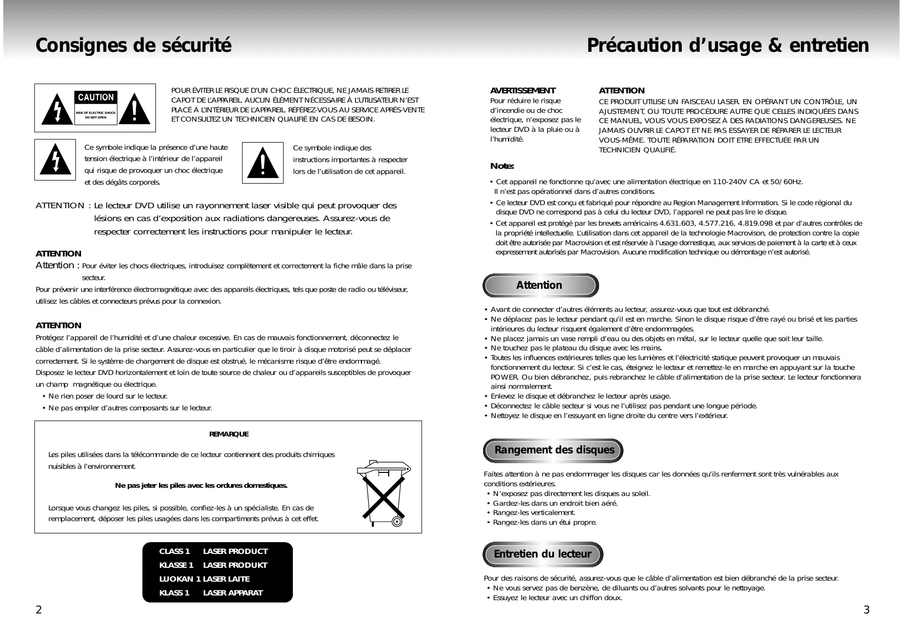 • Cet appareil est protégé par les brevets américains 4.631.603, 4.577.216, 4.819.098 et par d’autres contrôles de la propriété intellectuelle. L’utilisation dans cet appareil de la technologie Macrovison, de protection contre la copie doit être autorisée par Macrovision et est réservée à l’usage domestique, aux services de paiement à la carte et à ceux expressement autorisés par Macrovision. Aucune modification technique ou démontage n’est autorisé. Attention : Pour éviter les chocs électriques, introduisez complètement et correctement la fiche mâle dans la prise secteur. Pour prévenir une interférence électromagnétique avec des appareils électriques, tels que poste de radio ou téléviseur, utilisez les câbles et connecteurs prévus pour la connexion. ATTENTION Protégez l’appareil de l’humidité et d’une chaleur excessive. En cas de mauvais fonctionnement, déconnectez le câble d’alimentation de la prise secteur. Assurez-vous en particulier que le tiroir à disque motorisé peut se déplacer correctement. Si le système de chargement de disque est obstrué, le mécanisme risque d’être endommagé. Disposez le lecteur DVD horizontalement et loin de toute source de chaleur ou d’appareils susceptibles de provoquer un champ magnétique ou électrique.