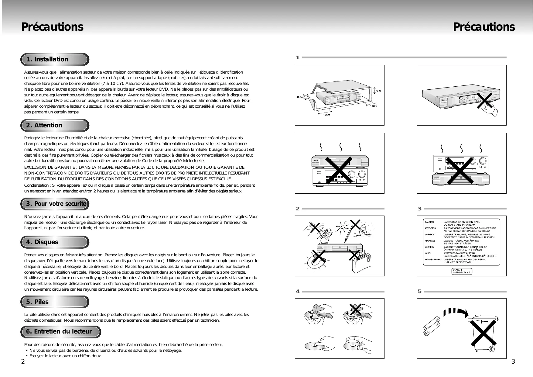N’ouvrez jamais l’appareil ni aucun de ses élements. Cela peut être dangereux pour vous et pour certaines piéces fragiles. Vour risquez de recevoir une décharge électrique ou un contact avec ke rayon laser. N’essayez pas de regarder à l’intérieur de l’appareil, ni par l’ouverture du tiroir, ni par toute autre ouverture.