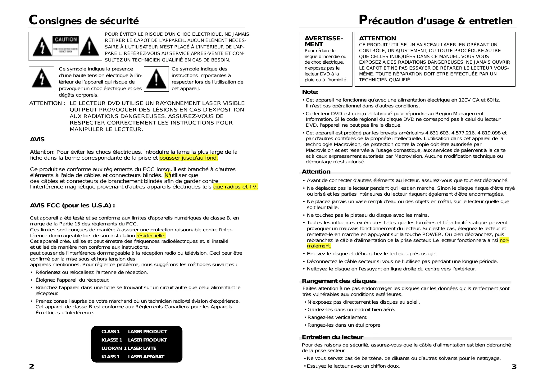 LASER APPARAT AVERTISSEMENT Pour réduire le risque d’incendie ou de choc électrique, n’exposez pas le lecteur DVD à la pluie ou à l’humidité. ATTENTION CE PRODUIT UTILISE UN FAISCEAU LASER. EN OPÉRANT UN CONTRÔLE, UN AJUSTEMENT, OU TOUTE PROCÉDURE AUTRE QUE CELLES INDIQUÉES DANS CE MANUEL, VOUS VOUS EXPOSEZ À DES RADIATIONS DANGEREUSES. NE JAMAIS OUVRIR LE CAPOT ET NE PAS ESSAYER DE RÉPARER LE LECTEUR VOUSMÊME. TOUTE RÉPARATION DOIT ETRE EFFECTUÉE PAR UN TECHNICIEN QUALIFIÉ. Note: