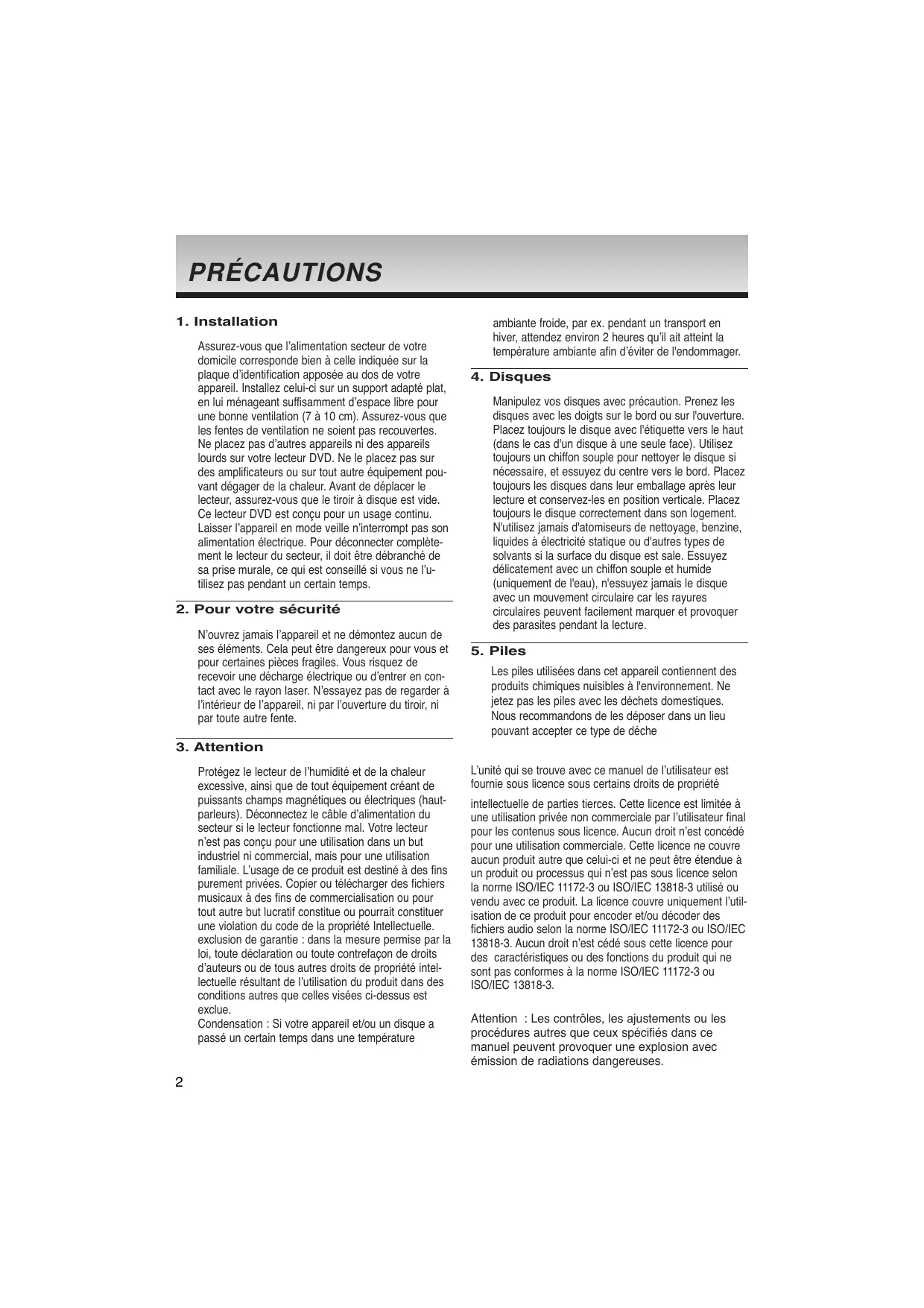 N’ouvrez jamais l’appareil et ne démontez aucun de ses éléments. Cela peut être dangereux pour vous et pour certaines pièces fragiles. Vous risquez de recevoir une décharge électrique ou d’entrer en contact avec le rayon laser. N’essayez pas de regarder à l’intérieur de l’appareil, ni par l’ouverture du tiroir, ni par toute autre fente. ambiante froide, par ex. pendant un transport en hiver, attendez environ 2 heures qu’il ait atteint la température ambiante afin d’éviter de l'endommager.