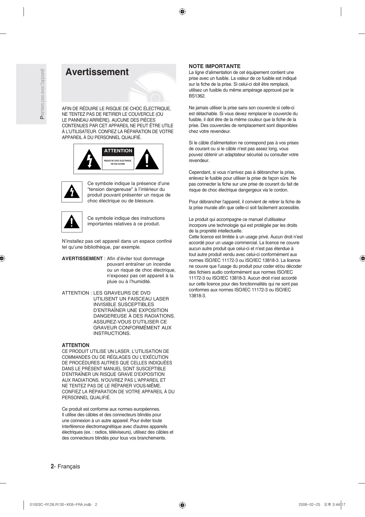 01003C-R128,R130-XEB-FRA.indb 2 2006-02-25 오후 3:44:17 Instructions importantes relatives à la sécurité Lisez attentivement ces instructions avant d’utiliser l’appareil. Suivez toutes les instructions relatives à la sécurité indiquées ci-dessous. Conservez ces instructions à portée de main afin de pouvoir vous y référer ultérieurement.