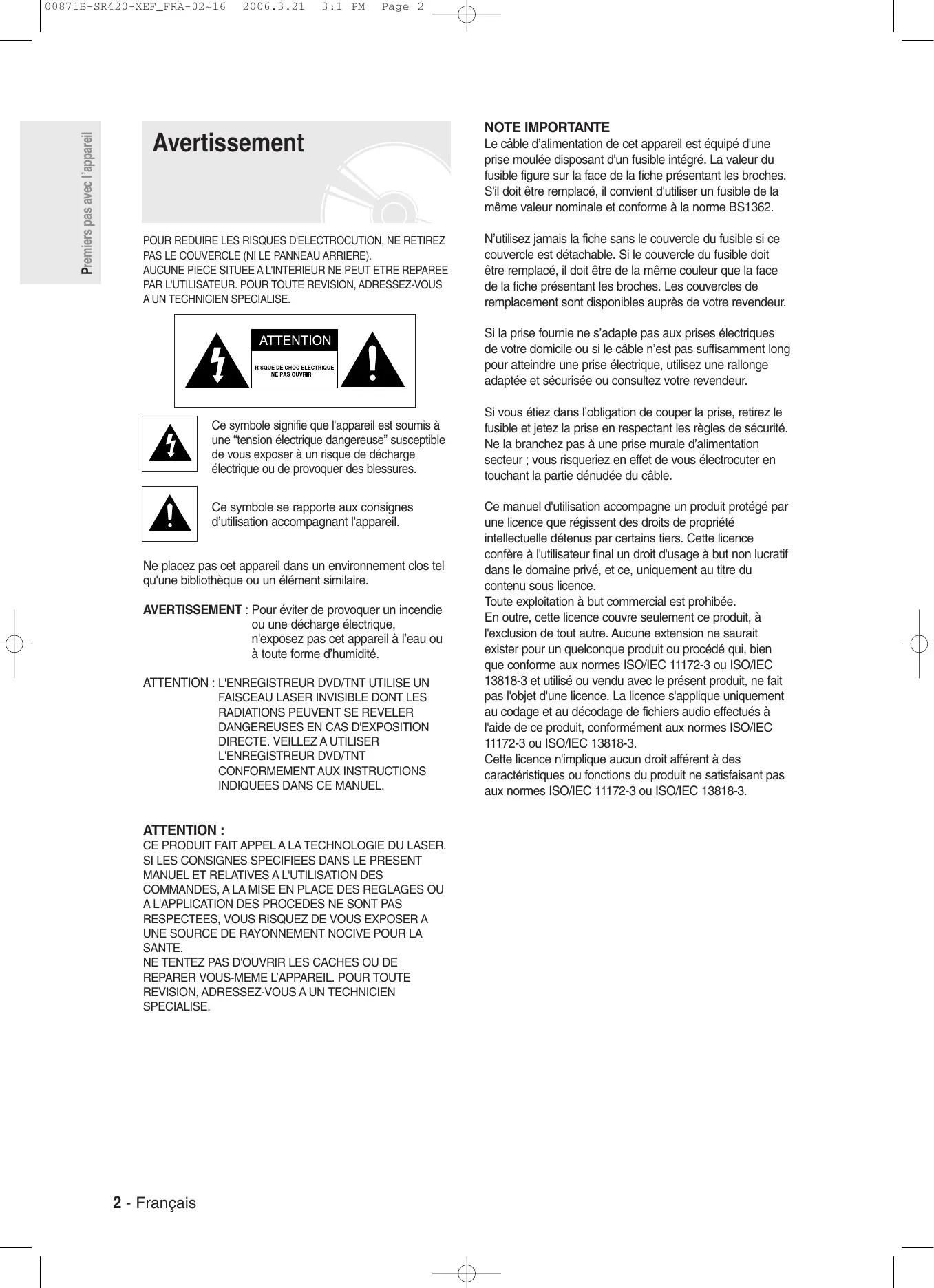 Notice SAMSUNG DVD-SR420 - page 2