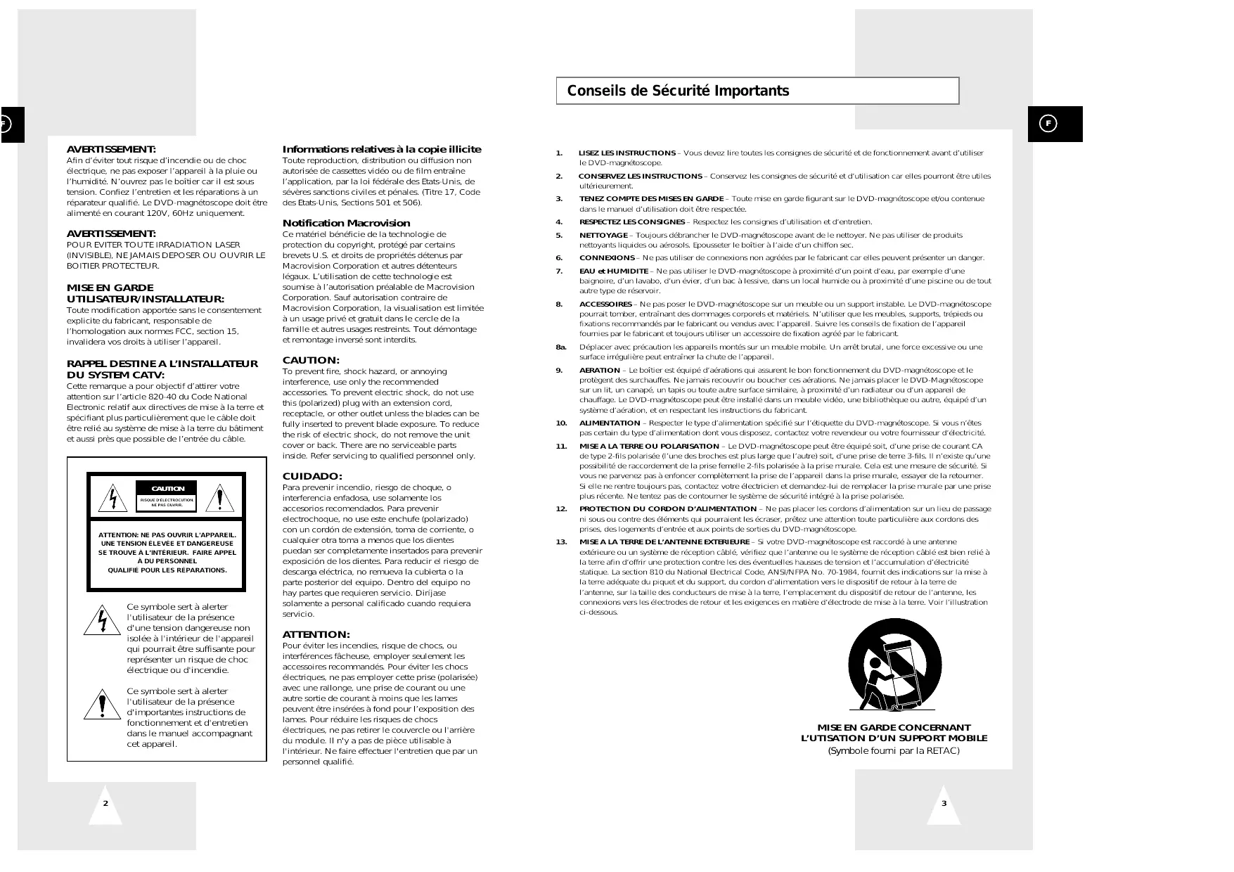 TENEZ COMPTE DES MISES EN GARDE – Toute mise en garde figurant sur le DVD-magnétoscope et/ou contenue dans le manuel d’utilisation doit être respectée. CUIDADO: CAUTION RISQUE D’ÉLECTROCUTION. NE PAS OUVRIR. ATTENTION: NE PAS OUVRIR L’APPAREIL.