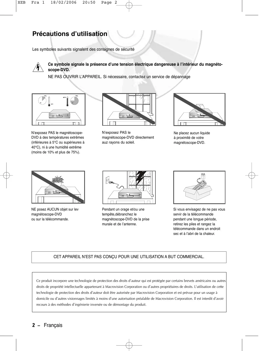 XEB Fra 1 18/02/2006 19:35 Page 1 Manuel d’utilisation DVD-V5600 DVD-V6600 PAL/SECAM www.samsung.fr XEB Fra 1 18/02/2006 20:50 Page 2 Précautions d’utilisation Les symboles suivants signalent des consignes de sécurité Ce symbole signale la présence d’une tension électrique dangereuse à l’intérieur du magnétoscope-DVD. NE PAS OUVRIR L’APPAREIL. Si nécessaire, contactez un service de dépannage N’exposez PAS le magnétoscopeDVD à des températures extrêmes (inférieures à 5°C ou supérieures à 40°C), ni à une humidité extrême (moins de 10% et plus de 75%). N’exposez PAS le magnétoscope-DVD directement auz rayons du soleil. Ne placez aucun liquide à proximité de votre magnétoscope-DVD. NE posez AUCUN objet sur lev magnétoscope-DVD ou sur la télécommande. Pendant un orage et/ou une tempête,débranchez le magnétoscope-DVD de la prise murale et de l’antenne. Si vous envisagez de ne pas vous servir de la télécommande pendant une longue période, retirez les piles et rangez la télécommande dans un endroit sec et à l’abri de la chaleur. CET APPAREIL N’EST PAS CONÇU POUR UNE UTILISATION A BUT COMMERCIAL. Ce produit incorpore une technologie de protection des droits d’auteur qui est protégée par certains brevets américains ou autres droits de propriété intellectuelle appartenant à Macrovision Corporation ou d’autres propriétaires de droits. L’utilisation de cette technologie de protection des droits d’auteur doit être autorisée par Macrovision Corporation et est prévue pour un usage à domicile ou d’autres visionnages limités à moins d’une autorisation préalable de Macrovision Corporation. Il est interdit d’avoir recours à des méthodes d’ingénierie inversée ou de démontage du produit.