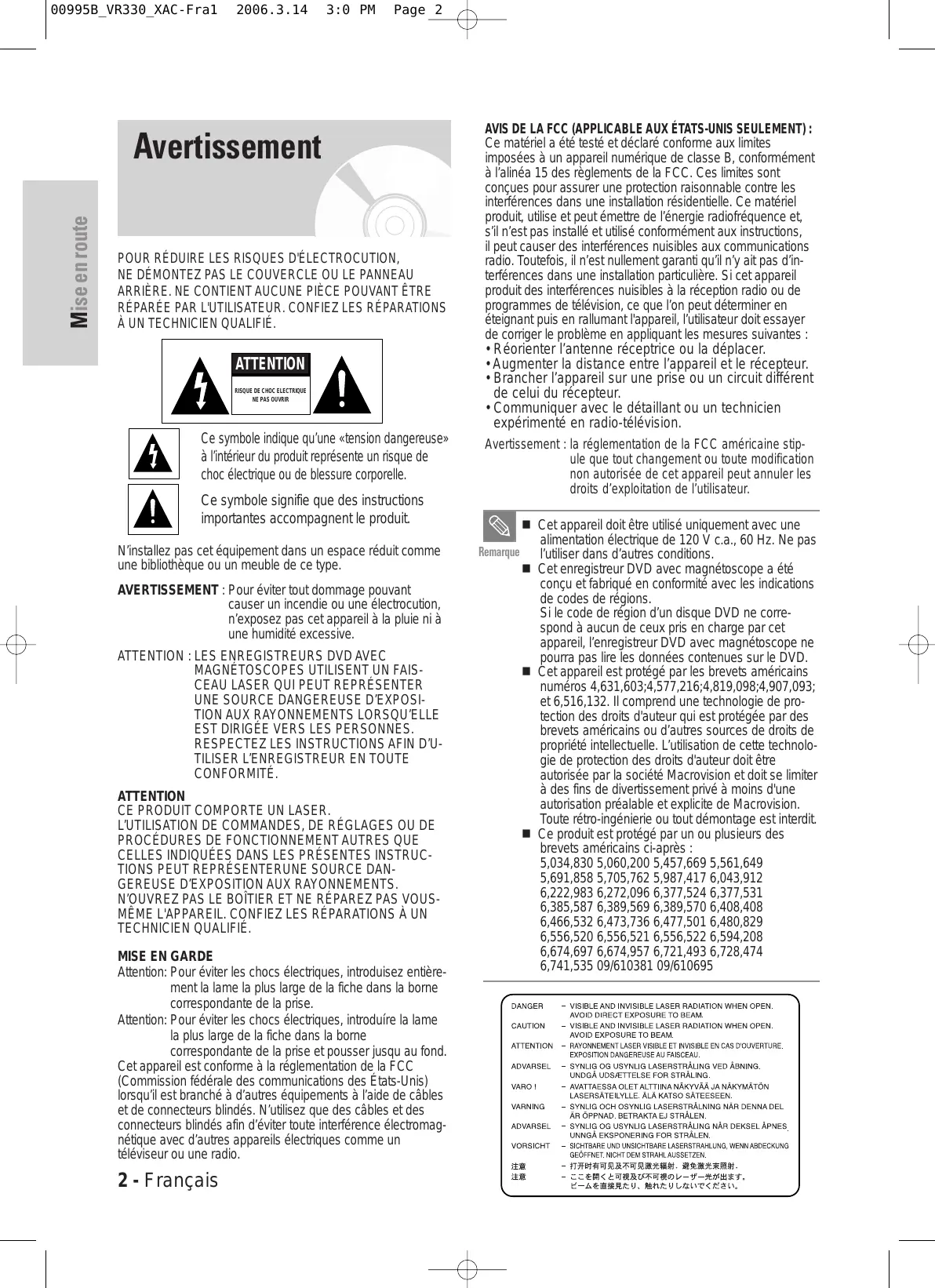• Réorienter l’antenne réceptrice ou la déplacer. • Augmenter la distance entre l’appareil et le récepteur. • Brancher l’appareil sur une prise ou un circuit différent de celui du récepteur. • Communiquer avec le détaillant ou un technicien expérimenté en radio-télévision. Avertissement : la réglementation de la FCC américaine stipule que tout changement ou toute modification non autorisée de cet appareil peut annuler les droits d’exploitation de l’utilisateur. Cet appareil doit être utilisé uniquement avec une alimentation électrique de 120 V c.a., 60 Hz. Ne pas Remarque l’utiliser dans d’autres conditions. Cet enregistreur DVD avec magnétoscope a été conçu et fabriqué en conformité avec les indications de codes de régions. Si le code de région d’un disque DVD ne correspond à aucun de ceux pris en charge par cet appareil, l’enregistreur DVD avec magnétoscope ne pourra pas lire les données contenues sur le DVD. Cet appareil est protégé par les brevets américains numéros 4,631,603;4,577,216;4,819,098;4,907,093; et 6,516,132. Il comprend une technologie de protection des droits d'auteur qui est protégée par des brevets américains ou d’autres sources de droits de propriété intellectuelle. L’utilisation de cette technologie de protection des droits d'auteur doit être autorisée par la société Macrovision et doit se limiter à des fins de divertissement privé à moins d'une autorisation préalable et explicite de Macrovision. Toute rétro-ingénierie ou tout démontage est interdit. Ce produit est protégé par un ou plusieurs des brevets américains ci-après : 5,034,830 5,060,200 5,457,669 5,561,649 5,691,858 5,705,762 5,987,417 6,043,912 6,222,983 6,272,096 6,377,524 6,377,531 6,385,587 6,389,569 6,389,570 6,408,408 6,466,532 6,473,736 6,477,501 6,480,829 6,556,520 6,556,521 6,556,522 6,594,208 6,674,697 6,674,957 6,721,493 6,728,474 6,741,535 09/610381 09/610695