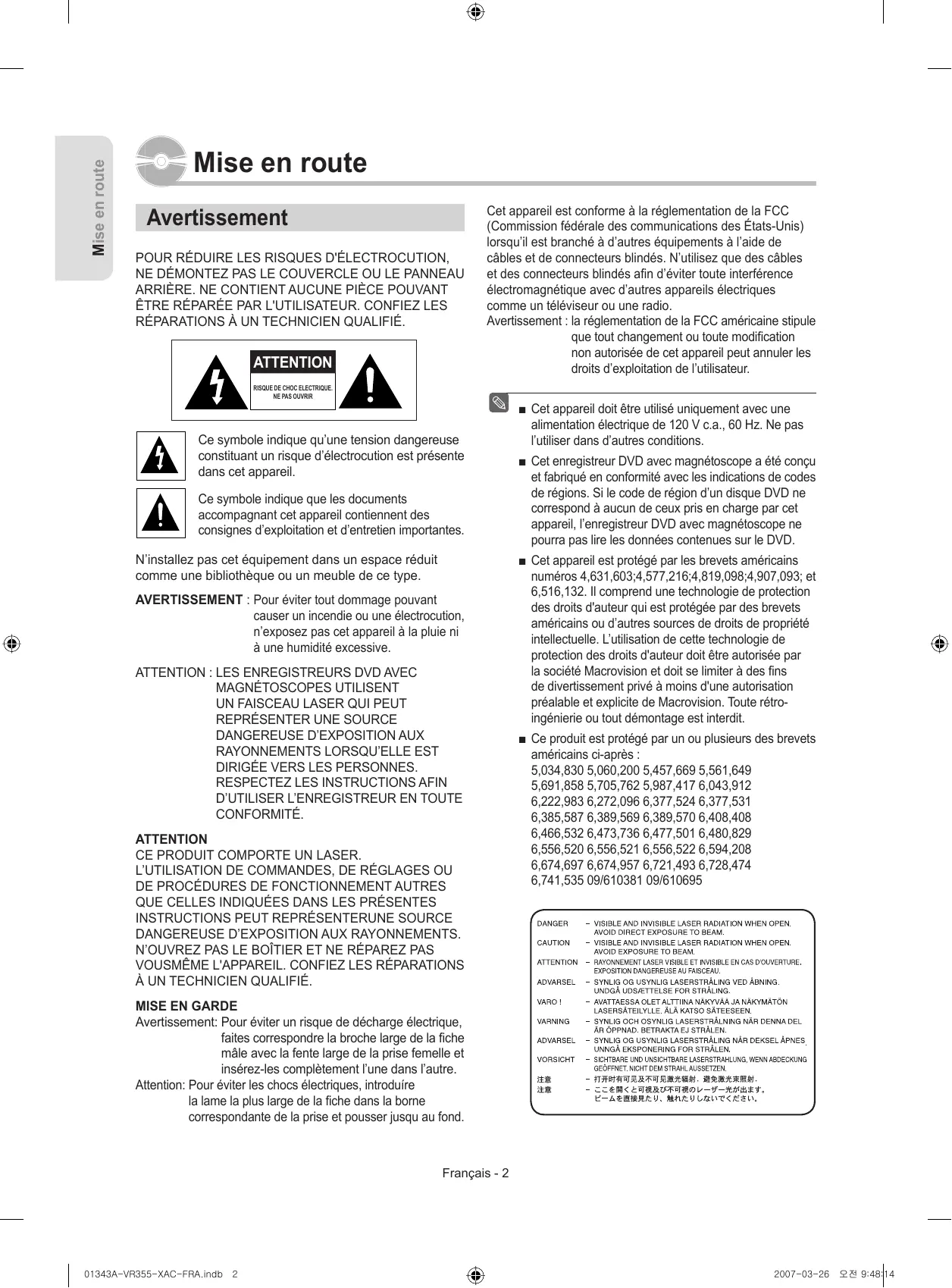 NE PAS OUVRIR Ce symbole indique qu’une tension dangereuse constituant un risque d’électrocution est présente dans cet appareil. Ce symbole indique que les documents accompagnant cet appareil contiennent des consignes d’exploitation et d’entretien importantes. N’installez pas cet équipement dans un espace réduit comme une bibliothèque ou un meuble de ce type. AVERTISSEMENT : Pour éviter tout dommage pouvant causer un incendie ou une électrocution, n’exposez pas cet appareil à la pluie ni à une humidité excessive. ATTENTION : LES ENREGISTREURS DVD AVEC MAGNÉTOSCOPES UTILISENT UN FAISCEAU LASER QUI PEUT REPRÉSENTER UNE SOURCE DANGEREUSE D’EXPOSITION AUX RAYONNEMENTS LORSQU’ELLE EST DIRIGÉE VERS LES PERSONNES. RESPECTEZ LES INSTRUCTIONS AFIN D’UTILISER L’ENREGISTREUR EN TOUTE CONFORMITÉ. ATTENTION CE PRODUIT COMPORTE UN LASER. L’UTILISATION DE COMMANDES, DE RÉGLAGES OU DE PROCÉDURES DE FONCTIONNEMENT AUTRES QUE CELLES INDIQUÉES DANS LES PRÉSENTES INSTRUCTIONS PEUT REPRÉSENTERUNE SOURCE DANGEREUSE D’EXPOSITION AUX RAYONNEMENTS. N’OUVREZ PAS LE BOÎTIER ET NE RÉPAREZ PAS VOUSMÊME L'APPAREIL. CONFIEZ LES RÉPARATIONS À UN TECHNICIEN QUALIFIÉ.