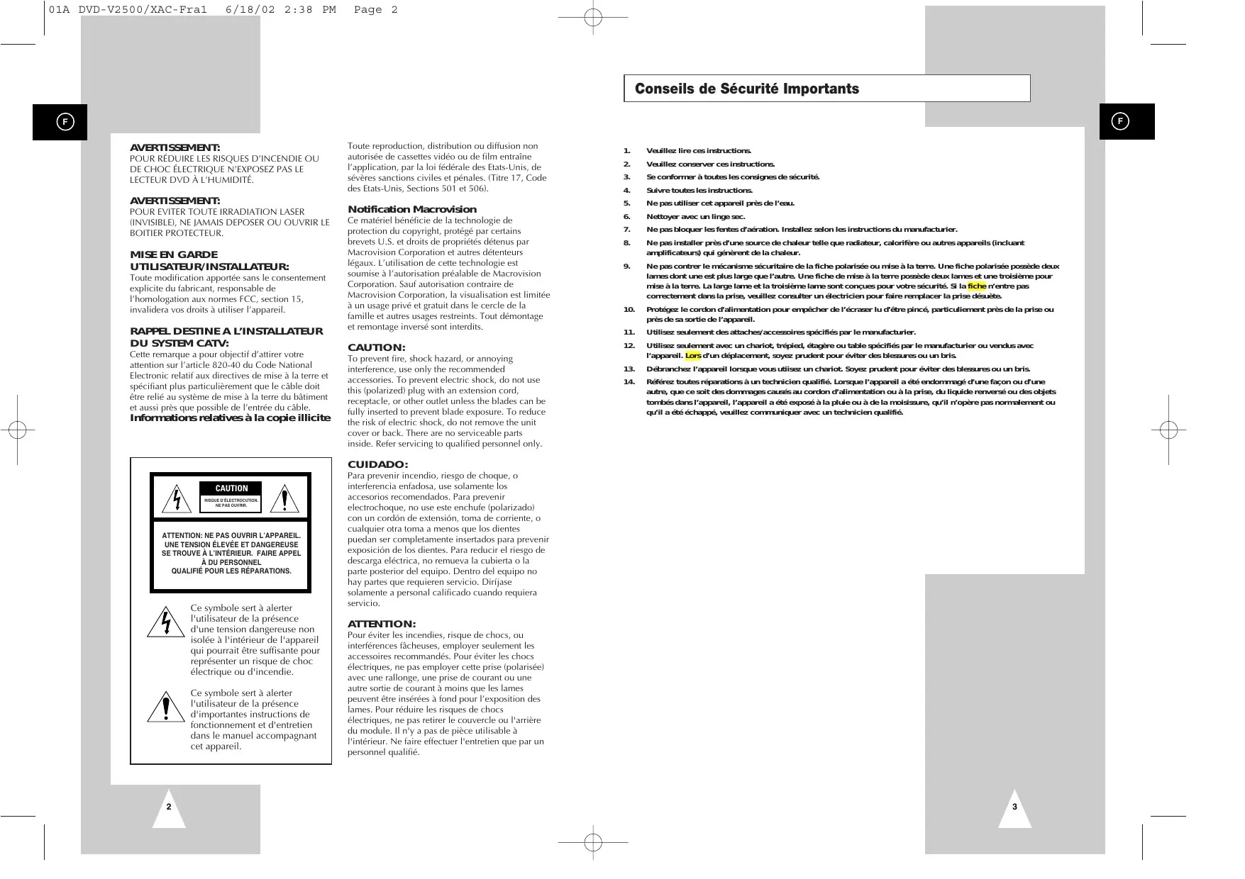 Ne pas utiliser cet appareil près de l’eau. Ce matériel bénéficie de la technologie de protection du copyright, protégé par certains brevets U.S. et droits de propriétés détenus par Macrovision Corporation et autres détenteurs légaux. L’utilisation de cette technologie est soumise à l’autorisation préalable de Macrovision Corporation. Sauf autorisation contraire de Macrovision Corporation, la visualisation est limitée à un usage privé et gratuit dans le cercle de la famille et autres usages restreints. Tout démontage et remontage inversé sont interdits.