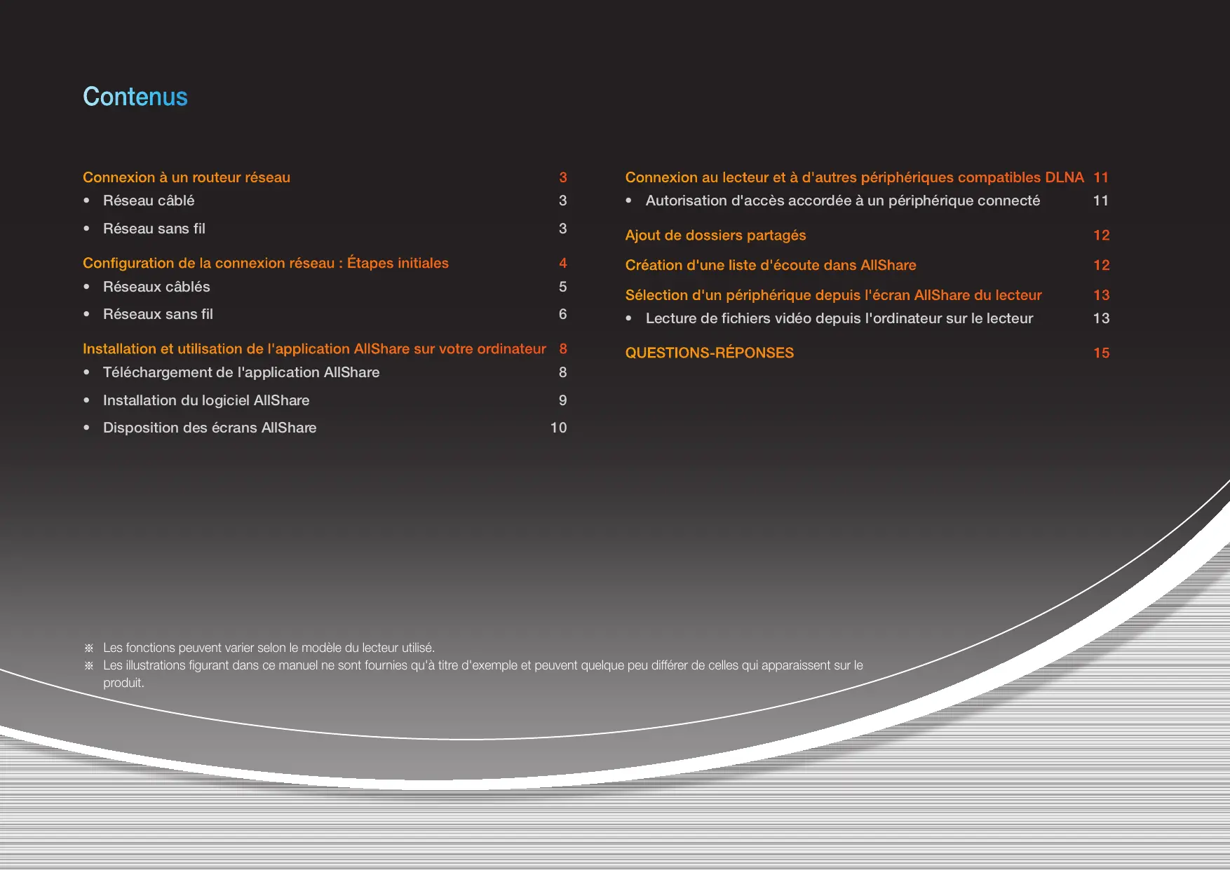 ✎✎ Assurez-vous de régler le téléviseur sur la source à laquelle vous avez connecté le lecteur Blu-ray. QUESTIONS-RÉPONSES Je viens d'installer AllShare sur mon ordinateur, mais je n'arrive pas à détecter l'ordinateur sur l'application AllShare du lecteur. ●● Vérifiez que le lecteur et l'ordinateur sont correctement branchés et leurs connexions sécurisées. ●● Assurez-vous que toutes les connexions de câble réseau (routeur vers ordinateur, routeur vers model, etc.) sont correctement branchées et sécurisées. ●● Vérifiez que le lecteur est connecté au réseau et que sa configuration réseau est correctement établie. ●● Assurez-vous que des adresses IP appropriées ont été attribuées au lecteur et à l'ordinateur. ●● Vérifiez que le lecteur et l'ordinateur sont connectés au même segment de réseau. Comparez les trois premiers ensembles de chiffres dans les adresses IP des deux appareils. Ils doivent être identiques. ●● Veillez à régler le lecteur sur Autorisé dans l'onglet Paramètres des privilèges AllShare (Tools > Settings > Privilege settings). ●● Certaines applications pare-feu qui s'exécutent sur l'ordinateur telles que McAfee ou Norton AntiVirus peuvent bloquer les opérations liées à AllShare ainsi que l'accès du lecteur à l'ordinateur. Arrêtez l'exécution de tels programmes ou réglez-les de manière à ce qu'ils autorisent les applications AllShare à accéder à l'ordinateur. Je n'arrive pas à retrouver les contenus multimédia, même si le fichier est défini pour être partagé sur l'ordinateur. ●● AllShare ne prend pas en charge tous les formats de fichiers partagés. Les fichiers dont les formats ne sont pas pris en charge par AllShare ne s'afficheront pas à l'écran de l'ordinateur, même s'ils sont partagés sur l'ordinateur. ●● Vous ne pouvez visionner que les fichiers de vidéo, de photo et de musique. Les sous-titres s'affichent correctement en cas de lecture de vidéo depuis un périphérique USB, mais pas lorsque la lecture s'effectue via AllShare et la connexion à l'ordinateur. ●● Vérifiez que le fichier de sous-titres et le fichier vidéo portent le même nom (par ex., Edge_City.mp4 and Edge City.srt) et qu'ils sont tous deux stockés dans le même dossier. ●● Notez que cette fonction n'est prise en charge que sur les produits Samsung compatibles avec AllShare. Cette fonction ne sera pas prise en charge si le téléphone intelligent que vous utilisez n'est pas un produit Samsung. Je n'arrive pas à trouver l'adresse IP du lecteur de disque Blu-ray dans le menu des réglages des droits d’accès du logiciel AllShare sur l'ordinateur. ●● Vérifiez que le lecteur est connecté au réseau et que sa configuration réseau est correctement établie. ●● Assurez-vous que des adresses IP appropriées ont été attribuées au lecteur et à l'ordinateur. ●● Vérifiez que le lecteur et l'ordinateur sont connectés au même segment de réseau. Comparez les trois premiers ensembles de chiffres dans les adresses IP des deux appareils. Ils doivent être identiques. ●● Vérifiez que le lecteur et l'ordinateur sont connectés au même routeur. ●● Le lecteur peut ne pas être reconnu sur un certain nombre de modèles ou de configurations de routeur. Vérifiez si le routeur utilisé prend en charge la multidiffusion. Le cas échéant, vérifiez la configuration de multidiffusion du routeur.