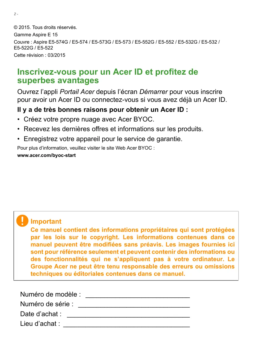 © 2015. Tous droits réservés. Gamme Aspire E 15 Couvre : Aspire E5-574G / E5-574 / E5-573G / E5-573 / E5-552G / E5-552 / E5-532G / E5-532 / E5-522G / E5-522 Cette révision : 03/2015 Inscrivez-vous pour un Acer ID et profitez de superbes avantages Ouvrez l’appli Portail Acer depuis l’écran Démarrer pour vous inscrire pour avoir un Acer ID ou connectez-vous si vous avez déjà un Acer ID. Il y a de très bonnes raisons pour obtenir un Acer ID :
