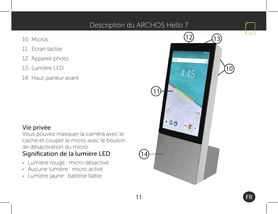 -- Lumière rouge : micro désactivé -- Aucune lumière : micro activé -- Lumière jaune : batterie faible