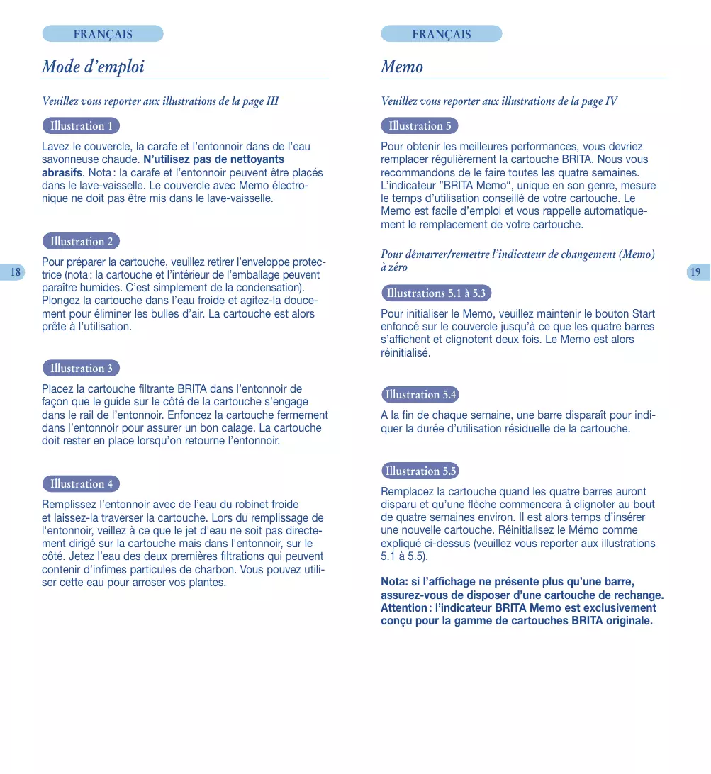 FRANÇAIS FRANÇAIS Mode d’emploi Memo Veuillez vous reporter aux illustrations de la page III Veuillez vous reporter aux illustrations de la page IV Illustration 1 Lavez le couvercle, la carafe et l’entonnoir dans de l’eau savonneuse chaude. N’utilisez pas de nettoyants abrasifs. Nota : la carafe et l’entonnoir peuvent être placés dans le lave-vaisselle. Le couvercle avec Memo électronique ne doit pas être mis dans le lave-vaisselle. Illustration 5 Pour obtenir les meilleures performances, vous devriez remplacer régulièrement la cartouche BRITA. Nous vous recommandons de le faire toutes les quatre semaines. L’indicateur ”BRITA Memo“, unique en son genre, mesure le temps d’utilisation conseillé de votre cartouche. Le Memo est facile d’emploi et vous rappelle automatiquement le remplacement de votre cartouche. Illustration 2
