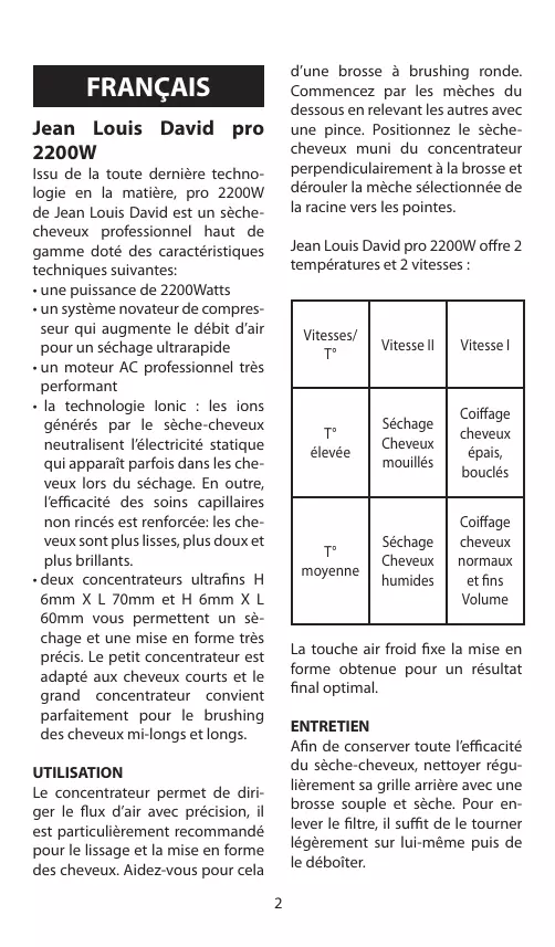 2200W Issu de la toute dernière technologie en la matière, pro 2200W de Jean Louis David est un sèchecheveux professionnel haut de gamme doté des caractéristiques techniques suivantes: