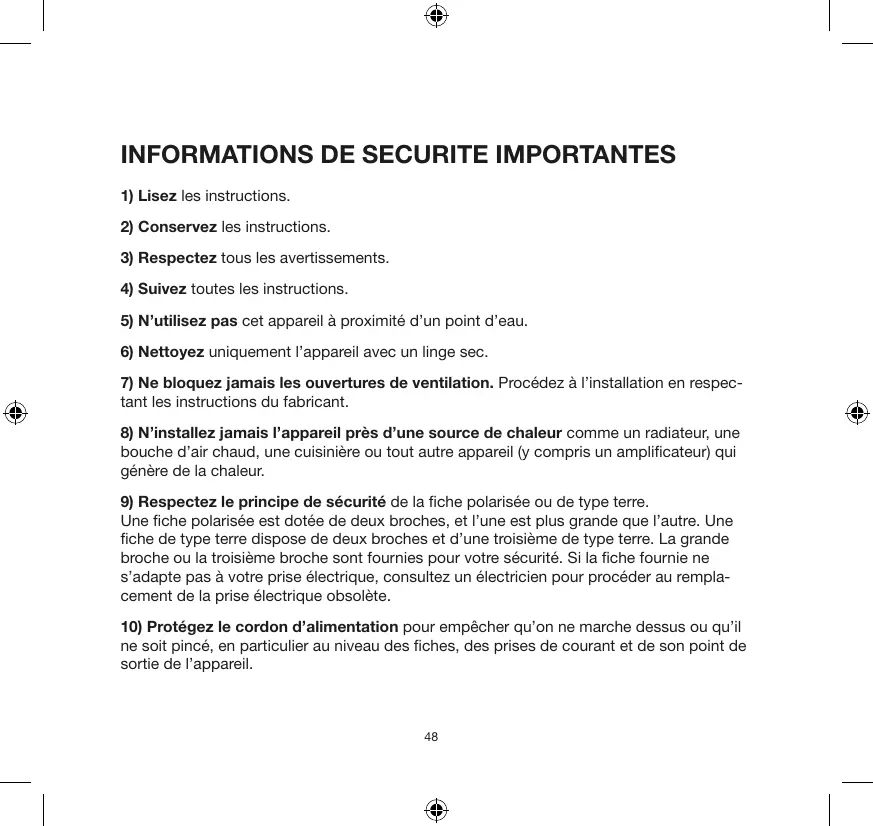 1) Lisez les instructions. 2) Conservez les instructions. 3) Respectez tous les avertissements. 4) Suivez toutes les instructions. 5) N'utilisez pas cet appareil à proximité d'un point d'eau. 6) Nettoyez uniquement l'appareil avec un linge sec. 7) Ne bloquez jamais les ouvertures de ventilation. Procédez à l'installation en respectant les instructions du fabricant. 8) N'installez jamais l'appareil près d'une source de chaleur comme un radiateur, une bouche d'air chaud, une cuisinière ou tout autre appareil (y compris un amplificateur) qui génère de la chaleur. 9) Respectez le principe de sécurité de la fiche polarisée ou de type terre.
