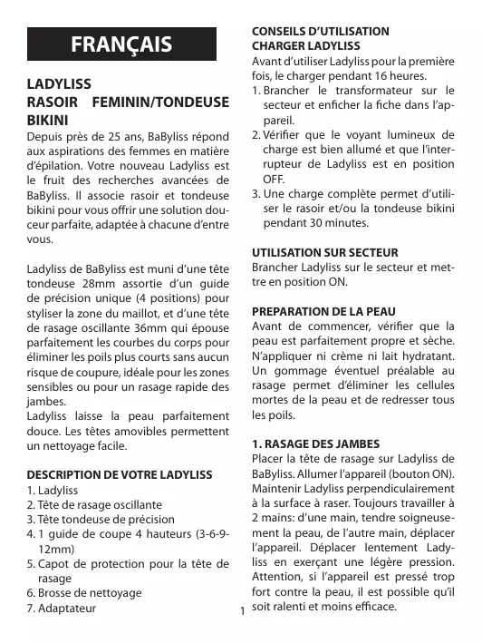 - Une charge complète permet d'utiliser le rasoir et/ou la tondeuse bikini pendant 30 minutes.
