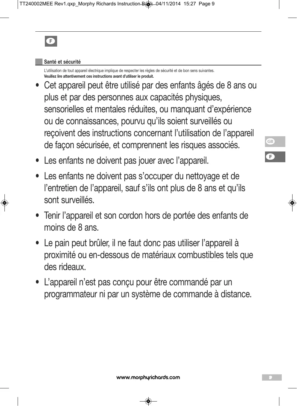 Si le problème, prévient d’une utilisation accidentelle, d’une utilisation abusive ou négligente, ou si l’appareil a été utilisé de manière contraire aux recommandations du fabricant, ou encore TT240002MEE Rev1.qxp_Morphy Richards Instruction Book 04/11/2014 15:27 Page 13 lorsque le problème provient de source de puissance ou de dégâts occasionnés en transit.
