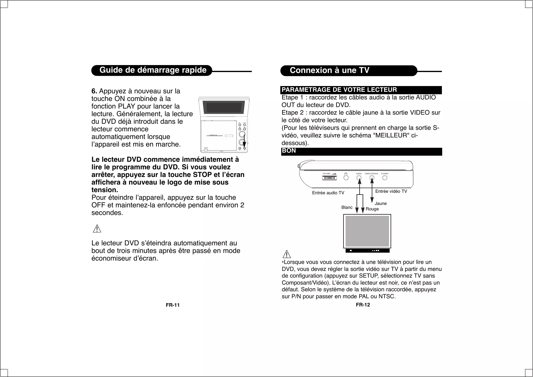 Lorsque vous vous connectez à une télévision pour lire un DVD, vous devez regarder la sortie vidéo sur TV à partir du menu de configuration (appuyez sur SETUP, sélectionnez TV sans Compositant/Video). L'écran du lecteur est noir, ce n'est pas un défaut. Selon le système de la télévision raccordée, appuyez sur P/N pour passer en mode PAL ou NTSC.