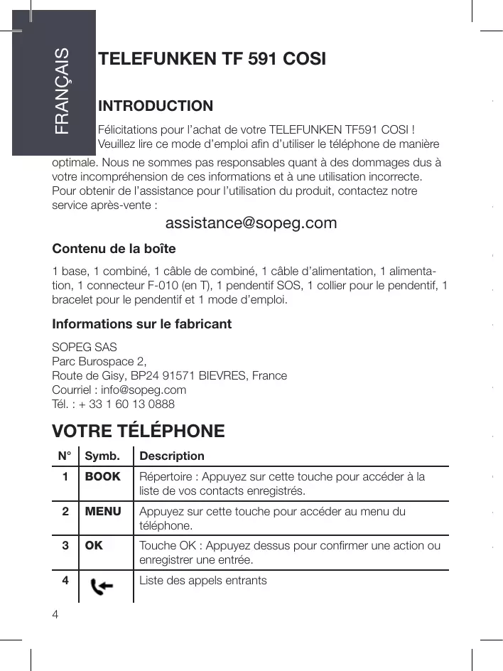INTRODUCTION Félicitations pour l’achat de votre TELEFUNKEN TF591 COSI ! Veuillez lire ce mode d’emploi afin d’utiliser le téléphone de manière optimale. Nous ne sommes pas responsables quant à des dommages dus à votre incompréhension de ces informations et à une utilisation incorrecte. Pour obtenir de l’assistance pour l’utilisation du produit, contactez notre service après-vente : assistance@sopeg.com Contenu de la boîte 1 base, 1 combiné, 1 câble de combiné, 1 câble d’alimentation, 1 alimentation, 1 connecteur F-010 (en T), 1 pendentif SOS, 1 collier pour le pendentif, 1 bracelet pour le pendentif et 1 mode d’emploi. Informations sur le fabricant SOPEG SAS Parc Burospace 2, Route de Gisy, BP24 91571 BIEVRES, France Courriel : info@sopeg.com Tél. : + 33 1 60 13 0888