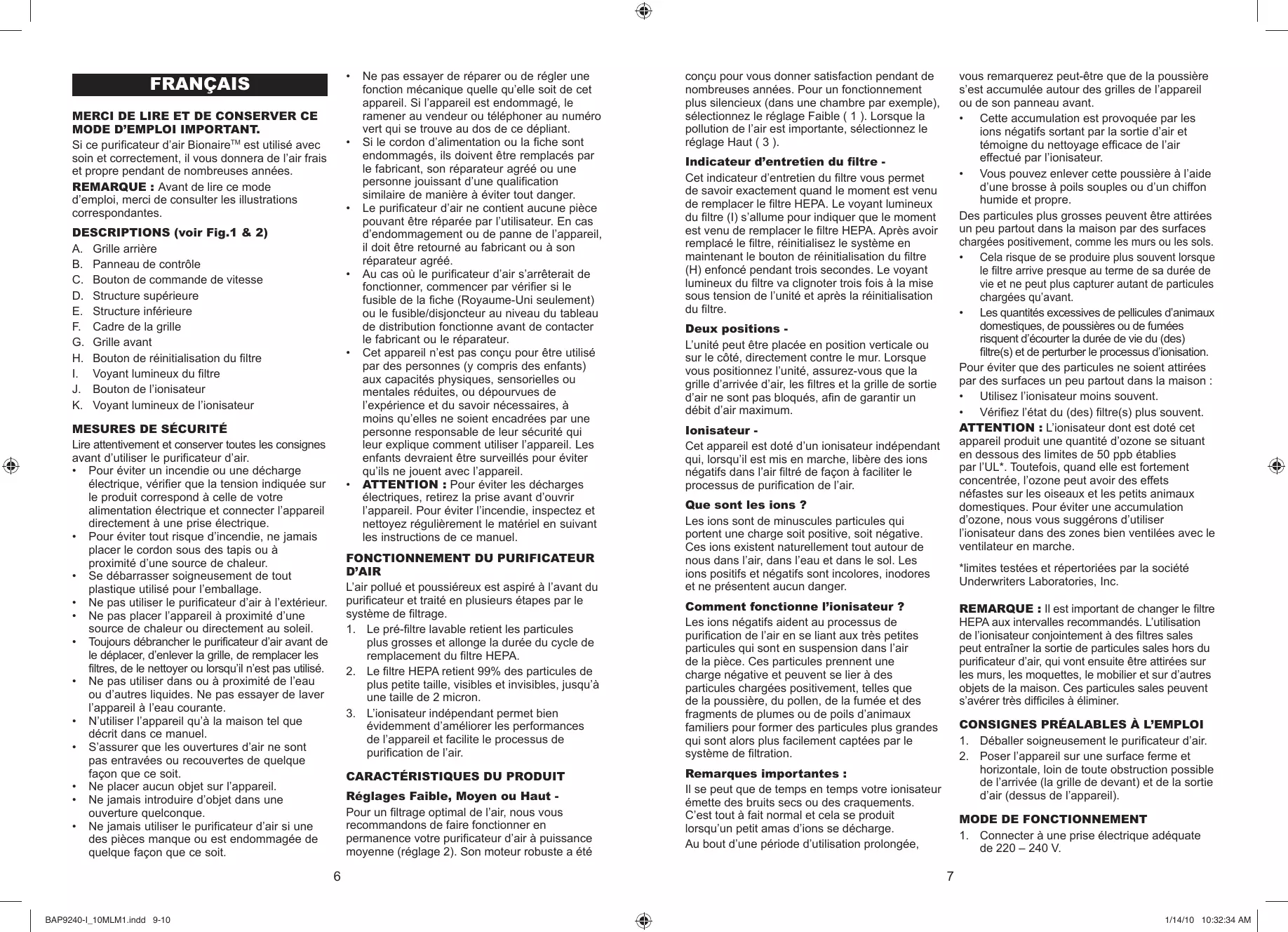 FRANÇAIS MERCI DE LIRE ET DE CONSERVER CE MODE D’EMPLOI IMPORTANT. Si ce purificateur d’air BionaireTM est utilisé avec soin et correctement, il vous donnera de l’air frais et propre pendant de nombreuses années. REMARQUE : Avant de lire ce mode d’emploi, merci de consulter les illustrations correspondantes.