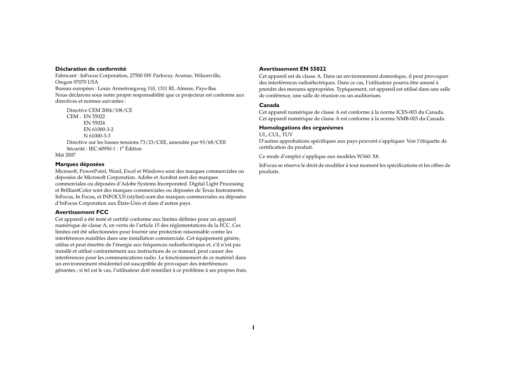 Microsoft, PowerPoint, Word, Excel et Windows sont des marques commerciales ou déposées de Microsoft Corporation. Adobe et Acrobat sont des marques commerciales ou déposées d'Adobe Systems Incorporated. Digital Light Processing et BrilliantColor sont des marques commerciales ou déposées de Texas Instruments. InFocus, In Focus, et INFOCUS (stylisé) sont des marques commerciales ou déposées d'InFocus Corporation aux États-Unis et dans d'autres pays.