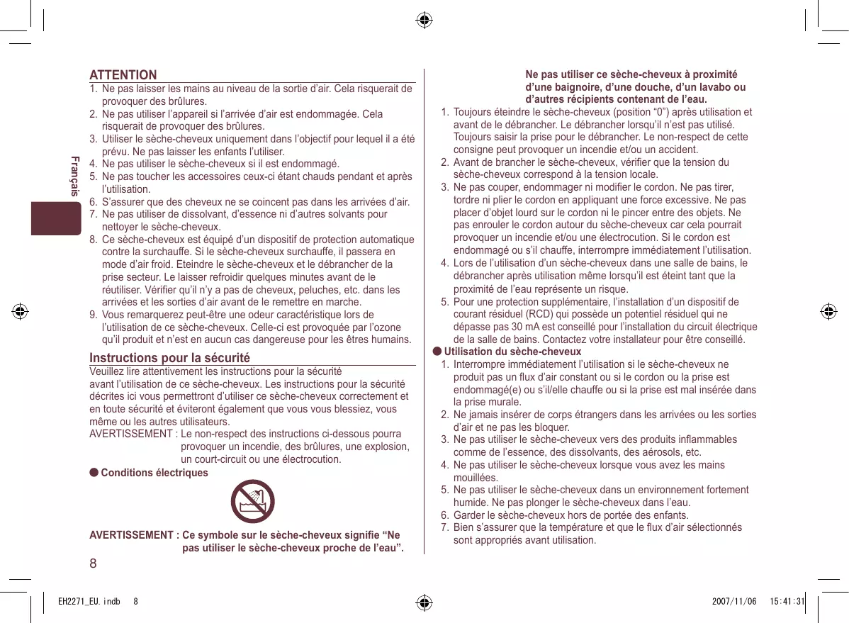 e symbole sur le sèche-cheveux signifie “Ne pas utiliser le sèche-cheveux proche de l’eau”. Ne pas utiliser ce sèche-cheveux à proximité d’une baignoire, d’une douche, d’un lavabo ou d’autres récipients contenant de l’eau.