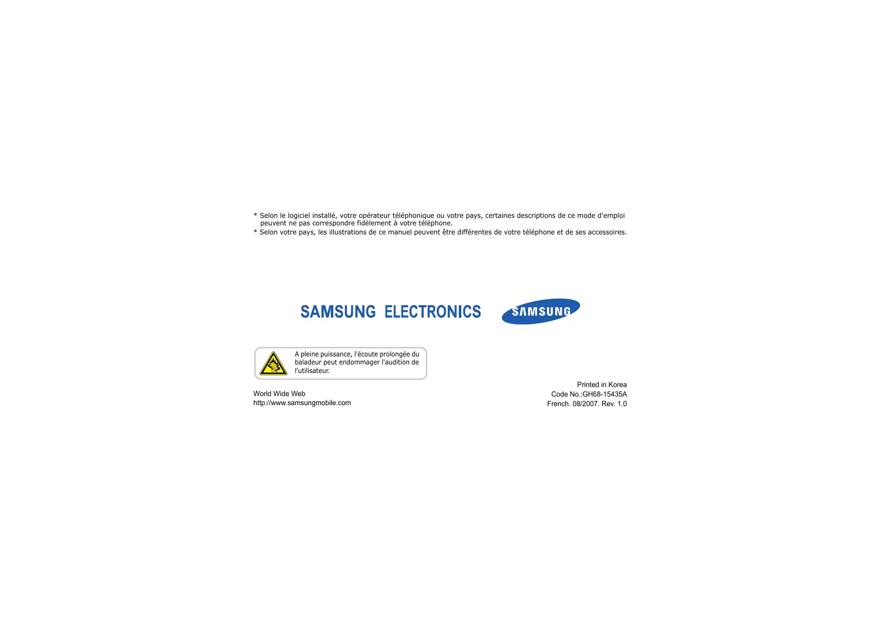 - Selon votre pays, les illustrations de ce manuel peuvent être différentes de votre téléphone et de ses accessoires. A pleine puissance, l'écoute prolongée du baladeur peut endommager l'audition de l'utilisateur. World Wide Web http://www.samsungmobile.com Printed in Korea Code No.:GH68-15435A French. 08/2007. Rev. 1.0 SGH-E950 Mode d'emploi N'utilisez jamais votre téléphone en conduisant. Garez votre véhicule avant d'utiliser un téléphone en prise directe. Consignes de sécurité importantes Le non-respect des consignes de sécurité suivantes peut être dangereux ou illégal. Copyright