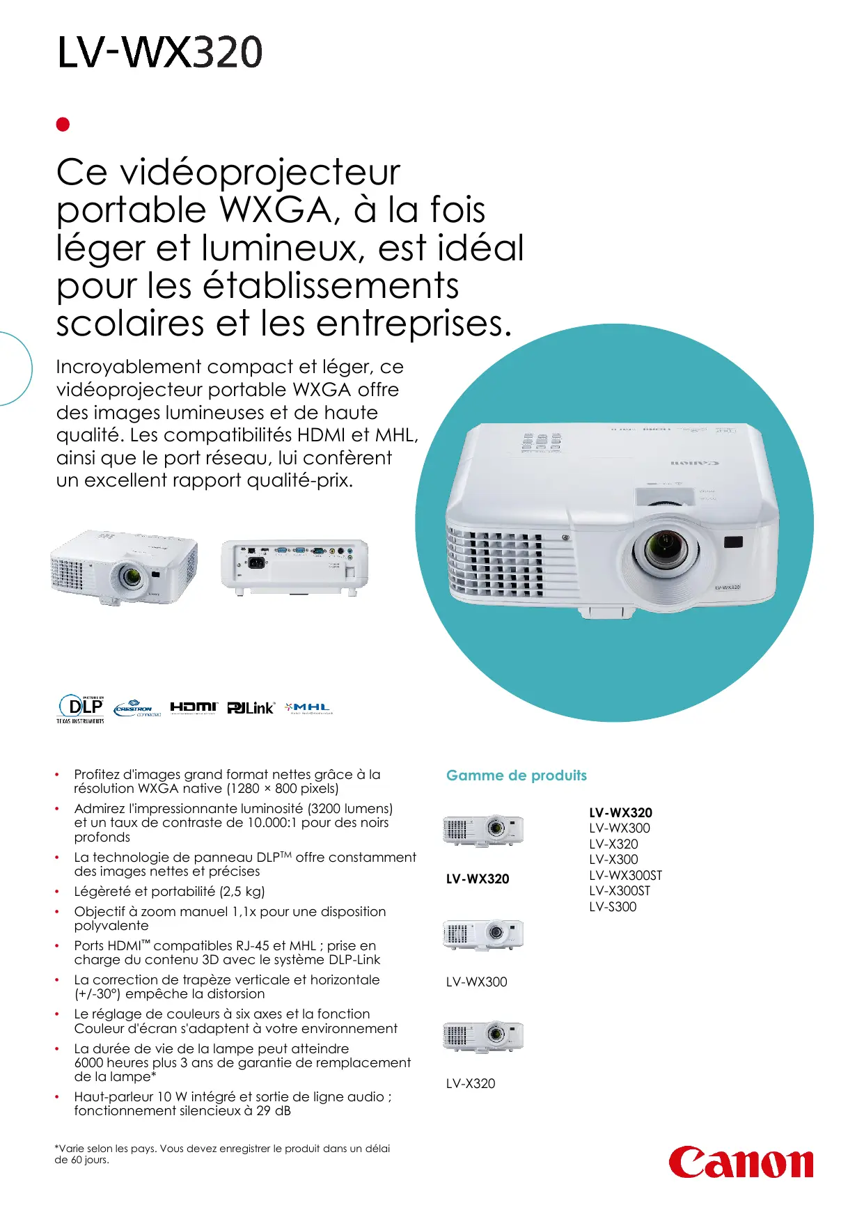 Haut-parleur 10 W intégré et sortie de ligne audio ; fonctionnement silencieux à 29 dB *Varie selon les pays. Vous devez enregistrer le produit dans un délai de 60 jours. Gamme de produits LV-WX320 LV-WX300 LV-X320 LV-WX320 LV-WX300 LV-X320 LV-X300 LV-WX300ST LV-X300ST LV-S300 Caractéristiques techniques PANNEAU
