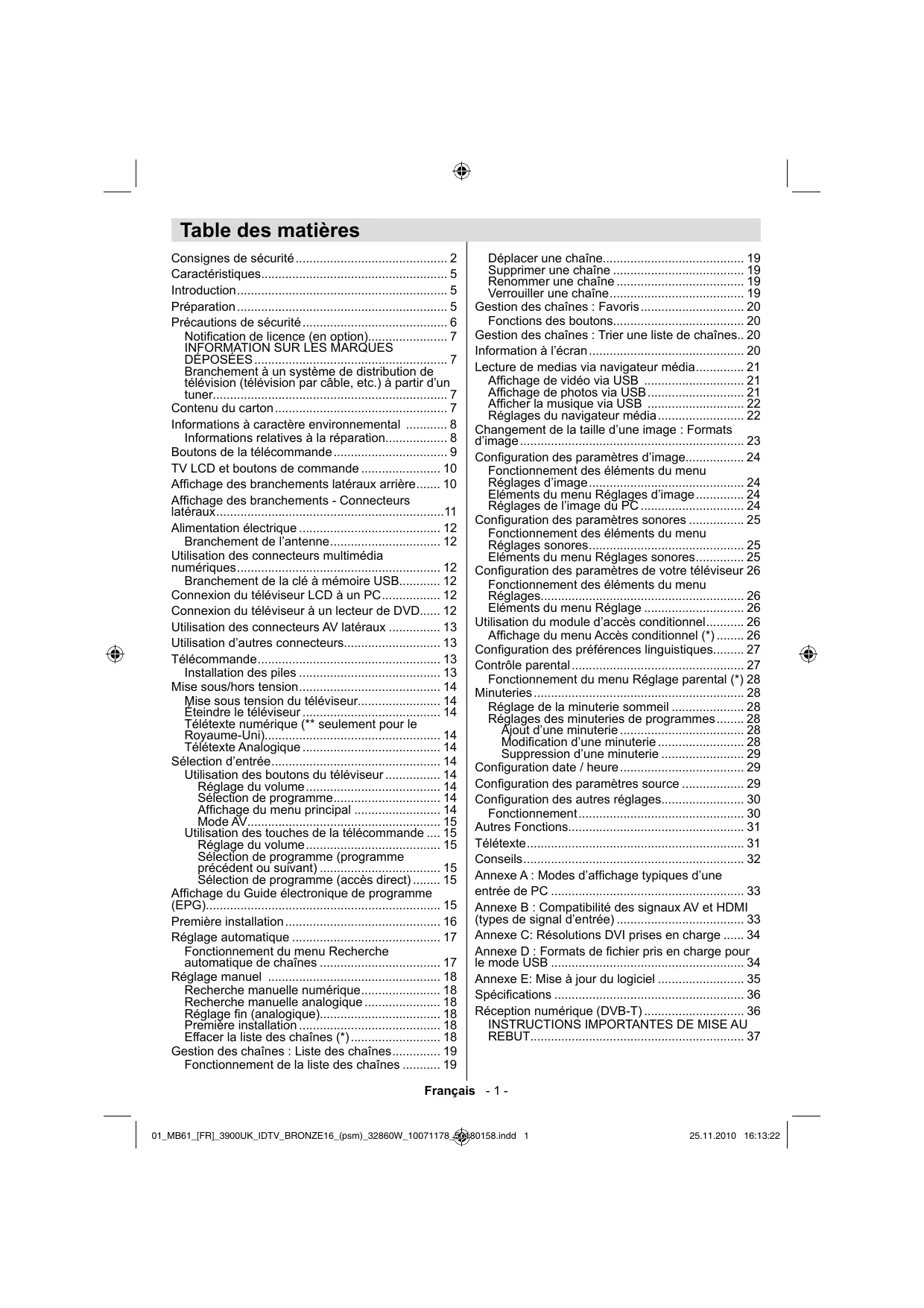 - Si celui-ci ne démarre pas après 10 minutes, débranchez-le, patientez 10 autres minutes, puis branches à nouveau. Il devrait s’ouvrir en toute sécurité, doté d’un nouveau logiciel. Si le téléviseur ne se remet toujours pas en marche, veuillez encore débrancher et brancher un certain nombre de fois encore. Si votre appareil ne parvient toujours pas à fonctionner, veuillez contacter le service d’assistance à la clientèle pour obtenir de l’aide. Attention : Évitez de débrancher le téléviseur lorsque le voyant DEL clignote pendant le redémarrage. Si vous le faites, votre téléviseur peut ne plus fonctionner correctement et vous aurez à le confier à un technicien agréé uniquement. Français - 35 - 01_MB61_[FR]_3900UK_IDTV_BRONZE16_(psm)_32860W_10071178_50180158.indd 35