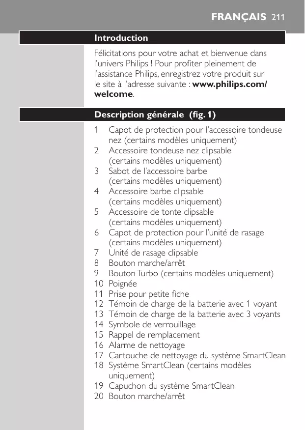 FRANÇAIS 211 Introduction Félicitations pour votre achat et bienvenue dans l’univers Philips ! Pour profiter pleinement de l’assistance Philips, enregistrez votre produit sur le site à l’adresse suivante : www.philips.com/ welcome. Description générale (fig. 1)
