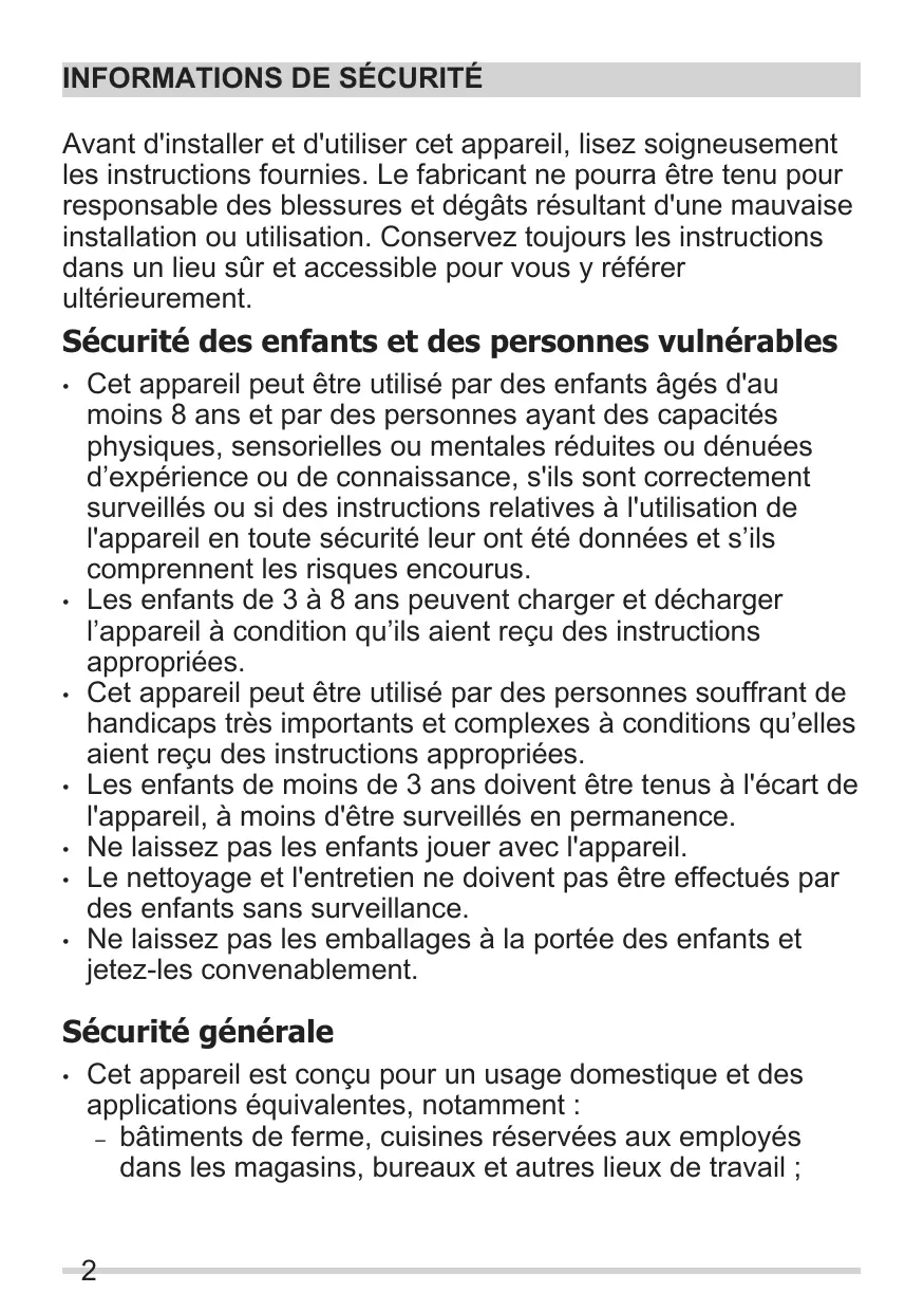 - Les enfants de 3 à 8 ans peuvent charger et décharger l'appareil à condition qu'ils aient reçu des instructions appropriées.