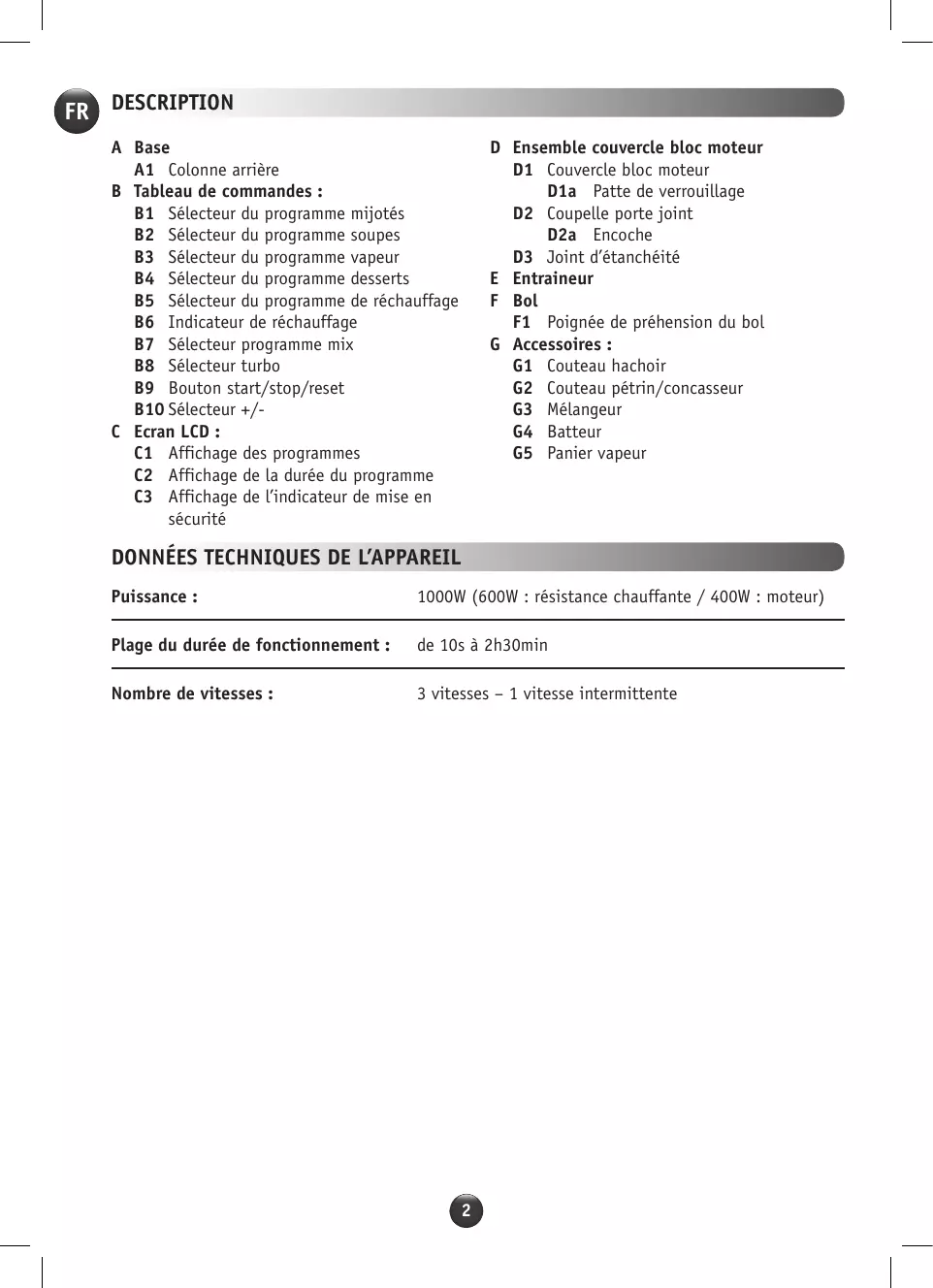 | Entretien et nettoyage | Bol et accessoires compatibles lave-vaisselle, nettoyage du moteur avec un chiffon humide |