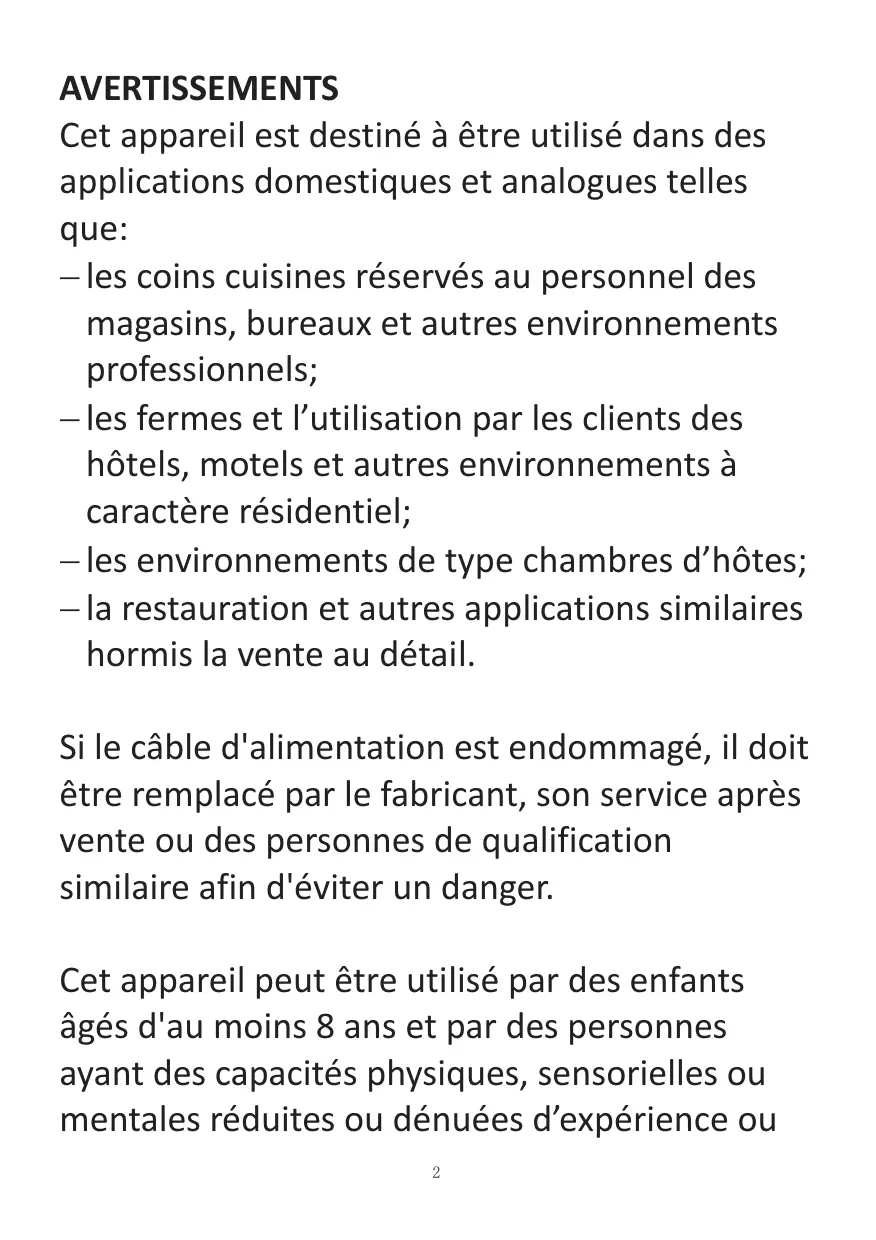AVERTISSEMENTS Cet appareil est destiné à être utilisé dans des applications domestiques et analogues telles que: les coins cuisines réservés au personnel des magasins, bureaux et autres environnements professionnels; les fermes et l’utilisation par les clients des hôtels, motels et autres environnements à caractère résidentiel; les environnements de type chambres d’hôtes; la restauration et autres applications similaires hormis la vente au détail. Si le câble d'alimentation est endommagé, il doit être remplacé par le fabricant, son service après vente ou des personnes de qualification similaire afin d'éviter un danger. Cet appareil peut être utilisé par des enfants âgés d'au moins 8 ans et par des personnes ayant des capacités physiques, sensorielles ou mentales réduites ou dénuées d’expérience ou
