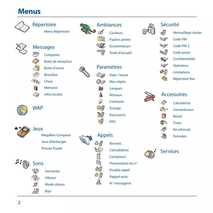 | Sons | Sonneries, vibreur, mode silence, bips |