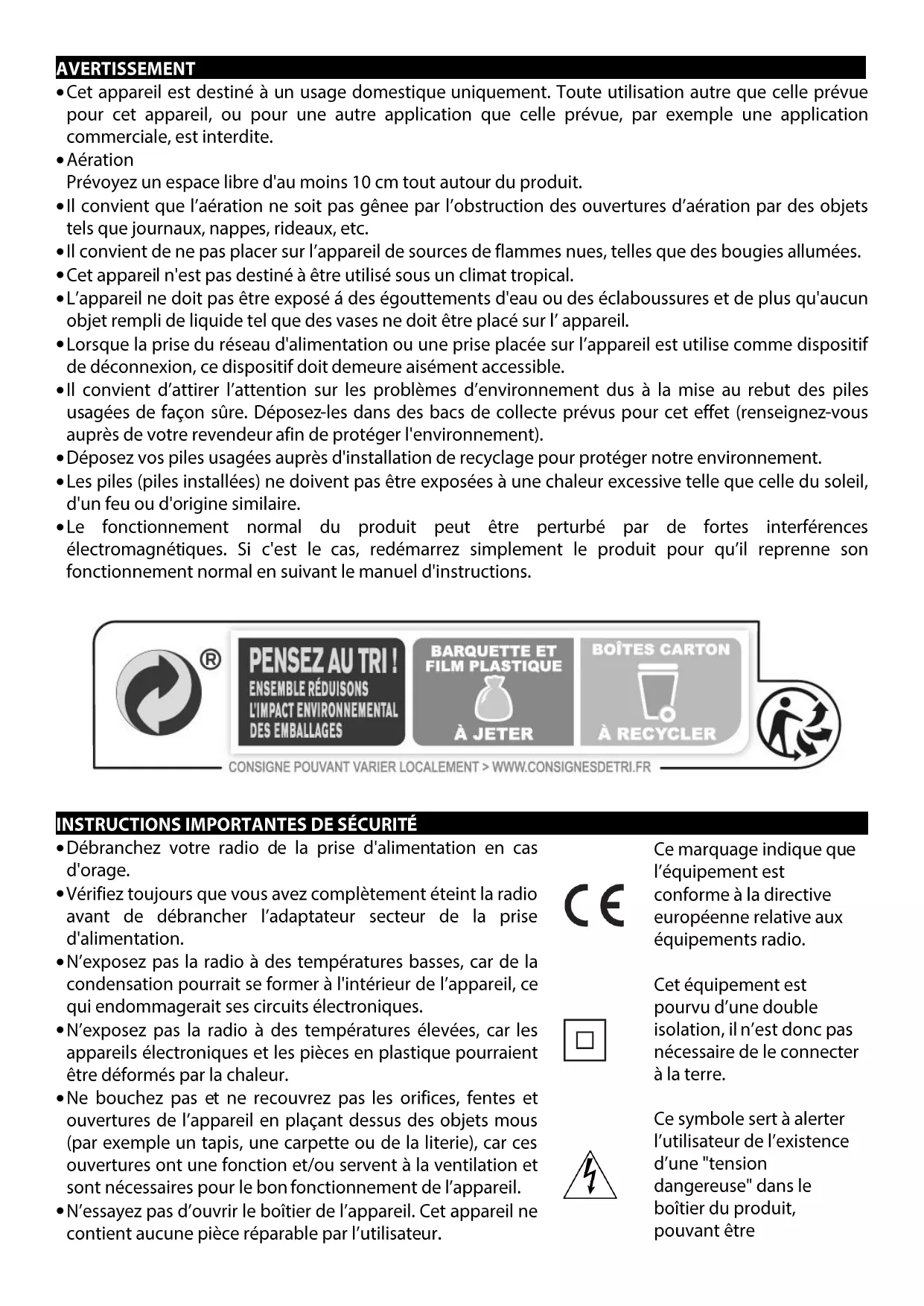 | Fonctions principales | Réception radio FM/AM, lecture de musique via Bluetooth, entrée auxiliaire |