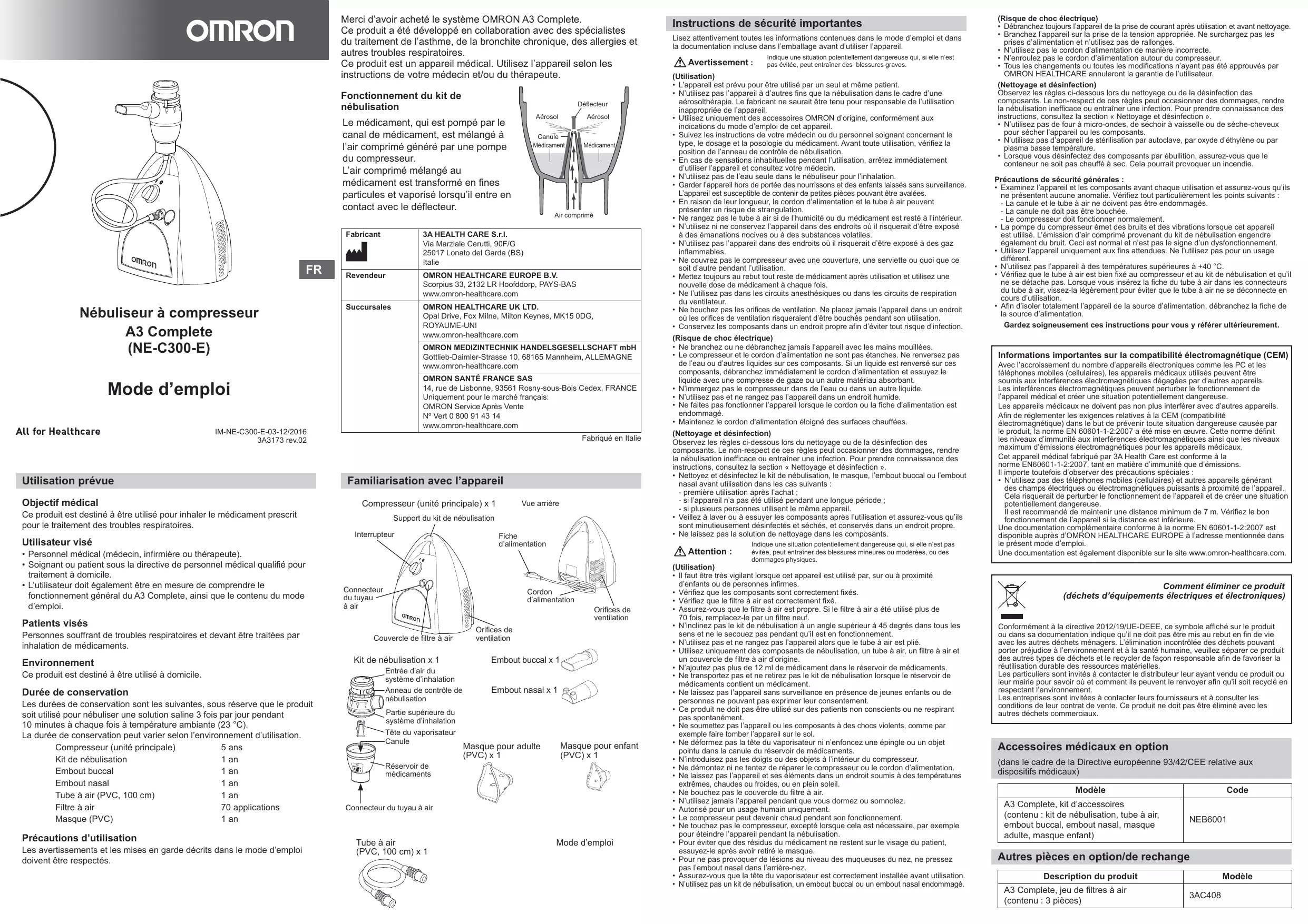 Mode d’emploi Indique une situation potentiellement dangereuse qui, si elle n’est pas évitée, peut entraîner des blessures graves. (Utilisation) L’appareil est prévu pour être utilisé par un seul et même patient. N’utilisez pas l’appareil à d’autres fins que la nébulisation dans le cadre d’une aérosolthérapie. Le fabricant ne saurait être tenu pour responsable de l’utilisation inappropriée de l’appareil. Utilisez uniquement des accessoires OMRON d’origine, conformément aux indications du mode d’emploi de cet appareil. Suivez les instructions de votre médecin ou du personnel soignant concernant le type, le dosage et la posologie du médicament. Avant toute utilisation, vérifiez la position de l’anneau de contrôle de nébulisation. En cas de sensations inhabituelles pendant l’utilisation, arrêtez immédiatement d’utiliser l’appareil et consultez votre médecin. N’utilisez pas de l’eau seule dans le nébuliseur pour l’inhalation. Garder l’appareil hors de portée des nourrissons et des enfants laissés sans surveillance. L’appareil est susceptible de contenir de petites pièces pouvant être avalées. En raison de leur longueur, le cordon d’alimentation et le tube à air peuvent présenter un risque de strangulation. Ne rangez pas le tube à air si de l’humidité ou du médicament est resté à l’intérieur. N’utilisez ni ne conservez l’appareil dans des endroits où il risquerait d’être exposé à des émanations nocives ou à des substances volatiles. N’utilisez pas l’appareil dans des endroits où il risquerait d’être exposé à des gaz inflammables. Ne couvrez pas le compresseur avec une couverture, une serviette ou quoi que ce soit d’autre pendant l’utilisation. Mettez toujours au rebut tout reste de médicament après utilisation et utilisez une nouvelle dose de médicament à chaque fois. Ne l’utilisez pas dans les circuits anesthésiques ou dans les circuits de respiration du ventilateur. Ne bouchez pas les orifices de ventilation. Ne placez jamais l’appareil dans un endroit où les orifices de ventilation risqueraient d’être bouchés pendant son utilisation. Conservez les composants dans un endroit propre afin d’éviter tout risque d’infection. (Risque de choc électrique) Ne branchez ou ne débranchez jamais l’appareil avec les mains mouillées. Le compresseur et le cordon d’alimentation ne sont pas étanches. Ne renversez pas de l’eau ou d’autres liquides sur ces composants. Si un liquide est renversé sur ces composants, débranchez immédiatement le cordon d’alimentation et essuyez le liquide avec une compresse de gaze ou un autre matériau absorbant. N’immergez pas le compresseur dans de l’eau ou dans un autre liquide. N’utilisez pas et ne rangez pas l’appareil dans un endroit humide. Ne faites pas fonctionner l’appareil lorsque le cordon ou la fiche d’alimentation est endommagé. Maintenez le cordon d’alimentation éloigné des surfaces chauffées. (Nettoyage et désinfection) Observez les règles ci-dessous lors du nettoyage ou de la désinfection des composants. Le non-respect de ces règles peut occasionner des dommages, rendre la nébulisation inefficace ou entraîner une infection. Pour prendre connaissance des instructions, consultez la section « Nettoyage et désinfection ». Nettoyez et désinfectez le kit de nébulisation, le masque, l’embout buccal ou l’embout nasal avant utilisation dans les cas suivants : - première utilisation après l’achat ; - si l’appareil n’a pas été utilisé pendant une longue période ; - si plusieurs personnes utilisent le même appareil. Veillez à laver ou à essuyer les composants après l’utilisation et assurez-vous qu’ils sont minutieusement désinfectés et séchés, et conservés dans un endroit propre. Ne laissez pas la solution de nettoyage dans les composants. Attention : Cordon d’alimentation Patients visés Personnes souffrant de troubles respiratoires et devant être traitées par inhalation de médicaments. Médicament Revendeur Ce produit est destiné à être utilisé pour inhaler le médicament prescrit pour le traitement des troubles respiratoires. Utilisateur visé Canule Médicament 3A HEALTH CARE S.r.l. Via Marziale Cerutti, 90F/G 25017 Lonato del Garda (BS) Italie IM-NE-C300-E-03-12/2016 3A3173 rev.02 Objectif médical Aérosol Fabricant Mode d’emploi Utilisation prévue Aérosol Instructions de sécurité importantes Indique une situation potentiellement dangereuse qui, si elle n’est pas évitée, peut entraîner des blessures mineures ou modérées, ou des dommages physiques. (Utilisation) Il faut être très vigilant lorsque cet appareil est utilisé par, sur ou à proximité d’enfants ou de personnes infirmes. Vérifiez que les composants sont correctement fixés. Vérifiez que le filtre à air est correctement fixé. Assurez-vous que le filtre à air est propre. Si le filtre à air a été utilisé plus de 70 fois, remplacez-le par un filtre neuf. N’inclinez pas le kit de nébulisation à un angle supérieur à 45 degrés dans tous les sens et ne le secouez pas pendant qu’il est en fonctionnement. N’utilisez pas et ne rangez pas l’appareil alors que le tube à air est plié. Utilisez uniquement des composants de nébulisation, un tube à air, un filtre à air et un couvercle de filtre à air d’origine. N’ajoutez pas plus de 12 ml de médicament dans le réservoir de médicaments. Ne transportez pas et ne retirez pas le kit de nébulisation lorsque le réservoir de médicaments contient un médicament. Ne laissez pas l’appareil sans surveillance en présence de jeunes enfants ou de personnes ne pouvant pas exprimer leur consentement. Ce produit ne doit pas être utilisé sur des patients non conscients ou ne respirant pas spontanément. Ne soumettez pas l’appareil ou les composants à des chocs violents, comme par exemple faire tomber l’appareil sur le sol