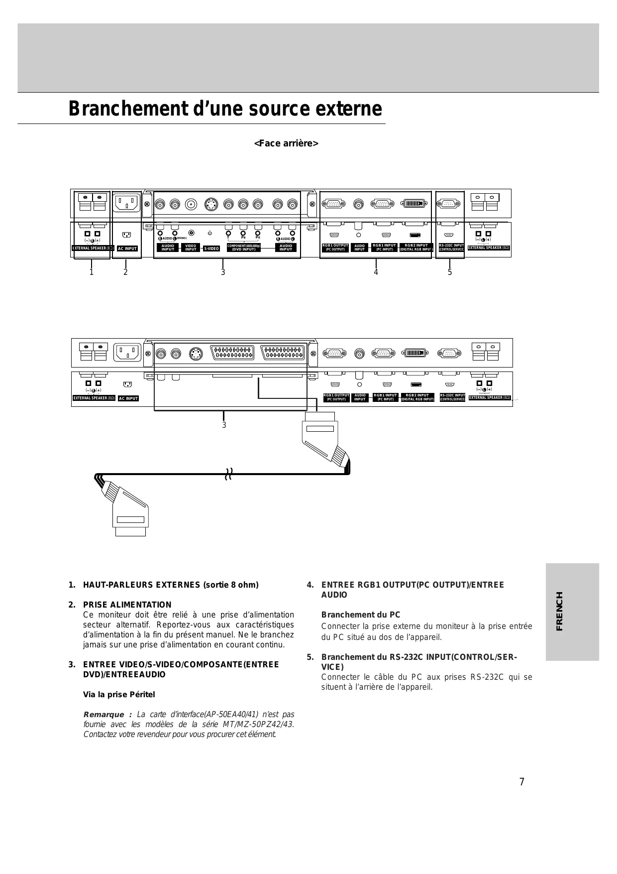 Connecter le câble du PC aux prises RS-232C qui se situent à l’arrière de l’appareil. Via la prise Péritel Remarque : La carte d’interface(AP-50EA40/41) n’est pas fournie avec les modèles de la série MT/MZ-50PZ42/43. Contactez votre revendeur pour vous procurer cet élément.