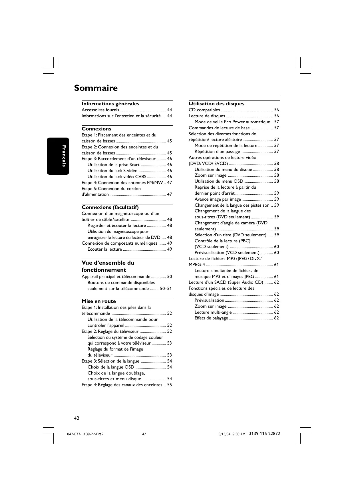 - Sommaire Informations générales Utilisation des disques Accessoires fournis p. 44