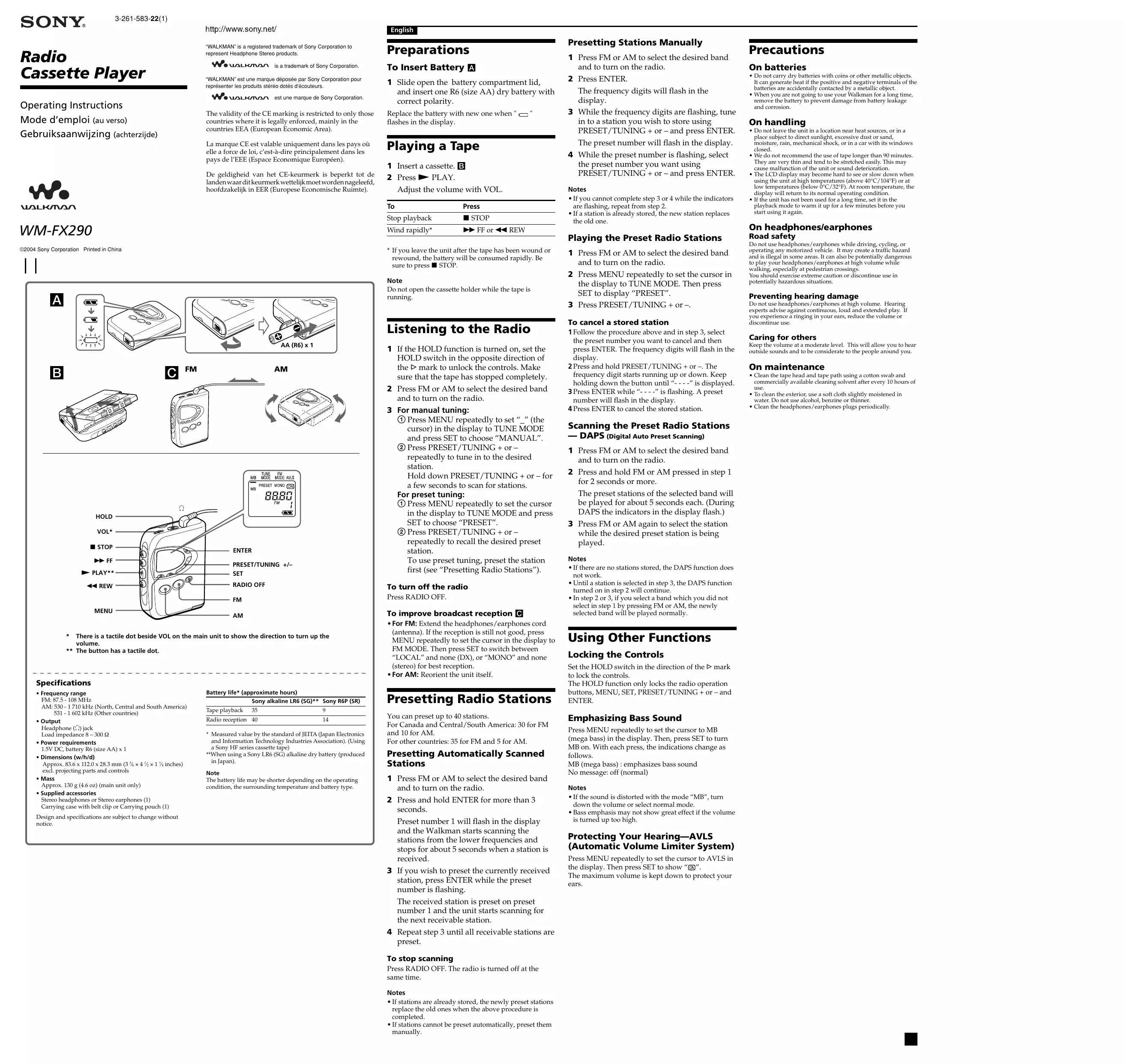 Retrouvez gratuitement la notice de l'appareil WM-FX290 SONY au format PDF.