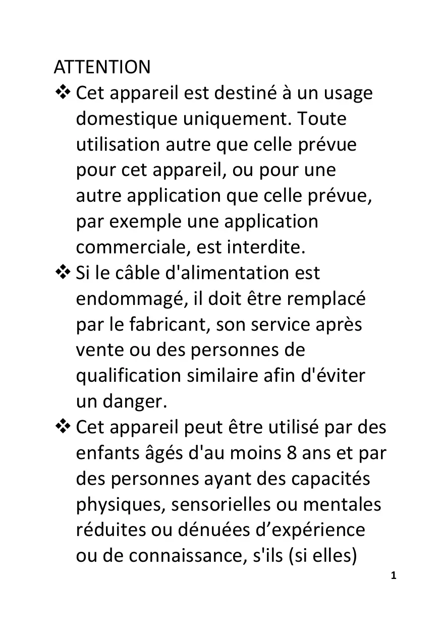 - DÉPANNAGE ATTENTION Cet appareil est destiné à un usage domestique uniquement. Toute utilisation autre que celle prévue pour cet appareil, ou pour une autre application que celle prévue, par exemple une application commerciale, est interdite. Si le câble d'alimentation est endommagé, il doit être remplacé par le fabricant, son service après vente ou des personnes de qualification similaire afin d'éviter un danger. Cet appareil peut être utilisé par des enfants âgés d'au moins 8 ans et par des personnes ayant des capacités physiques, sensorielles ou mentales réduites ou dénuées d’expérience ou de connaissance, s'ils (si elles) p. 20