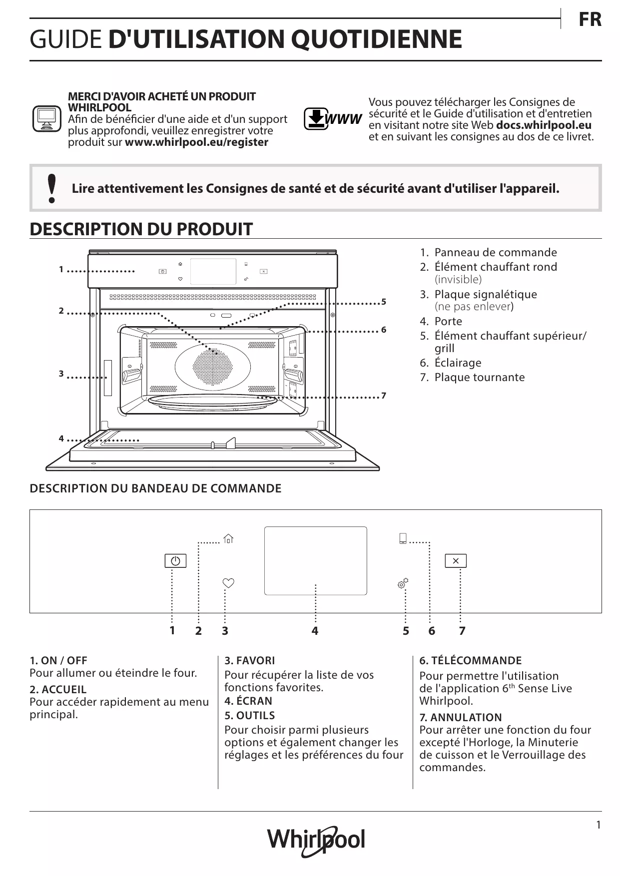 Vous pouvez télécharger les Consignes de sécurité et le Guide d'utilisation et d'entretien en visitant notre site Web docs.whirlpool.eu et en suivant les consignes au dos de ce livret. Lire attentivement les Consignes de santé et de sécurité avant d'utiliser l'appareil.