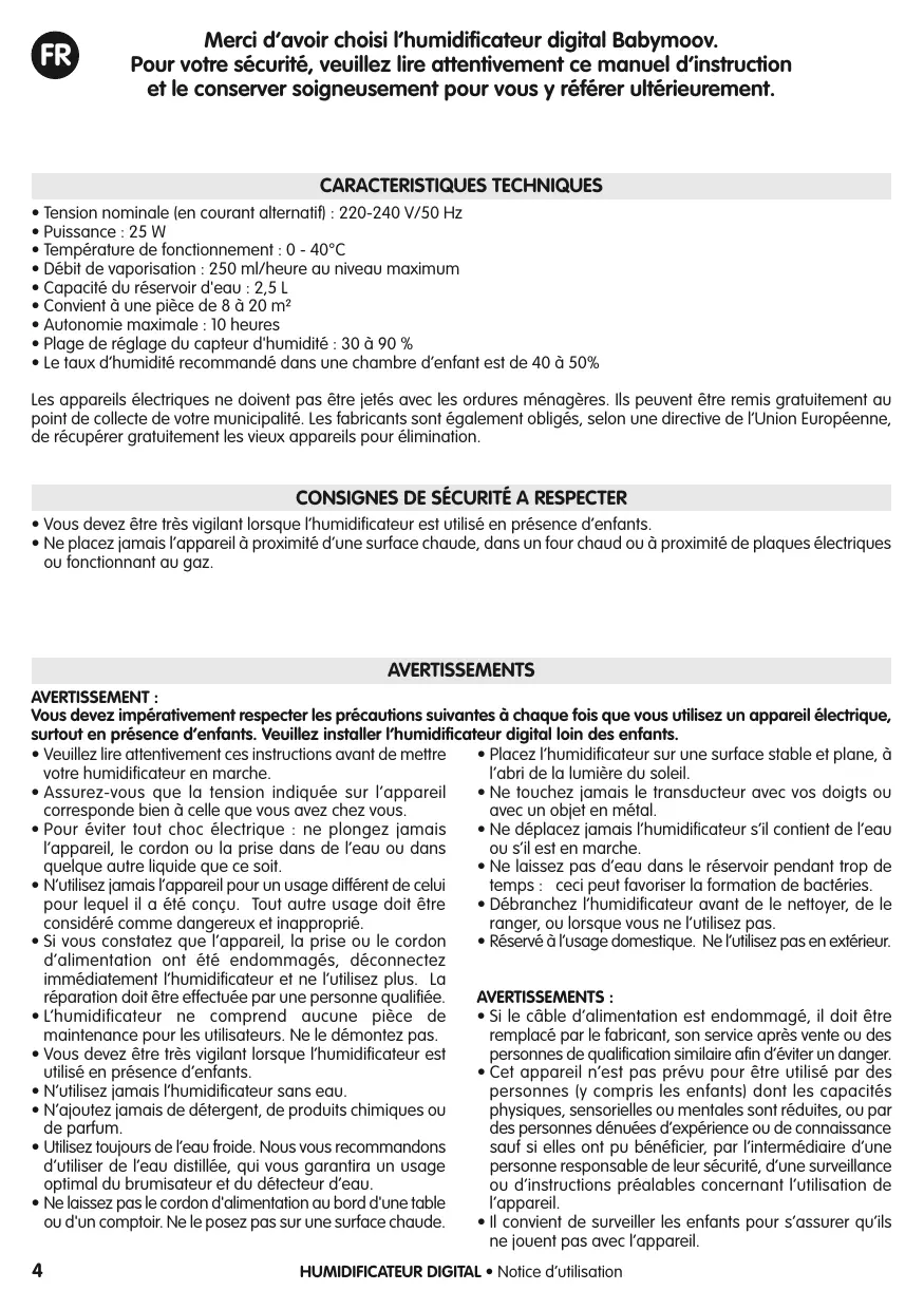 Merci d’avoir choisi l’humidificateur digital Babymoov. Pour votre sécurité, veuillez lire attentivement ce manuel d’instruction et le conserver soigneusement pour vous y référer ultérieurement. CARACTERISTIQUES TECHNIQUES