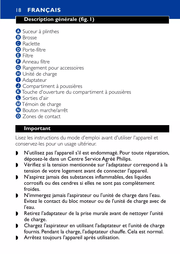 N'utilisez pas l'appareil s'il est endommagé. Pour toute réparation, déposez-le dans un Centre Service Agréé Philips. Vérifiez si la tension mentionnée sur l'adaptateur correspond à la tension de votre logement avant de connecter l'appareil. N'aspirez jamais des substances inflammables, des liquides corrosifs ou des cendres si elles ne sont pas complètement froides. N'immergez jamais l'aspirateur ou l'unité de charge dans l'eau. Evitez le contact du bloc moteur ou de l'unité de charge avec de l'eau. Retirez l'adaptateur de la prise murale avant de nettoyer l'unité de charge. Chargez l'aspirateur en utilisant l'adaptateur et l'unité de charge fournis. Pendant la charge, l'adaptateur chauffe. Cela est normal. Arrêtez toujours l'appareil après utilisation.