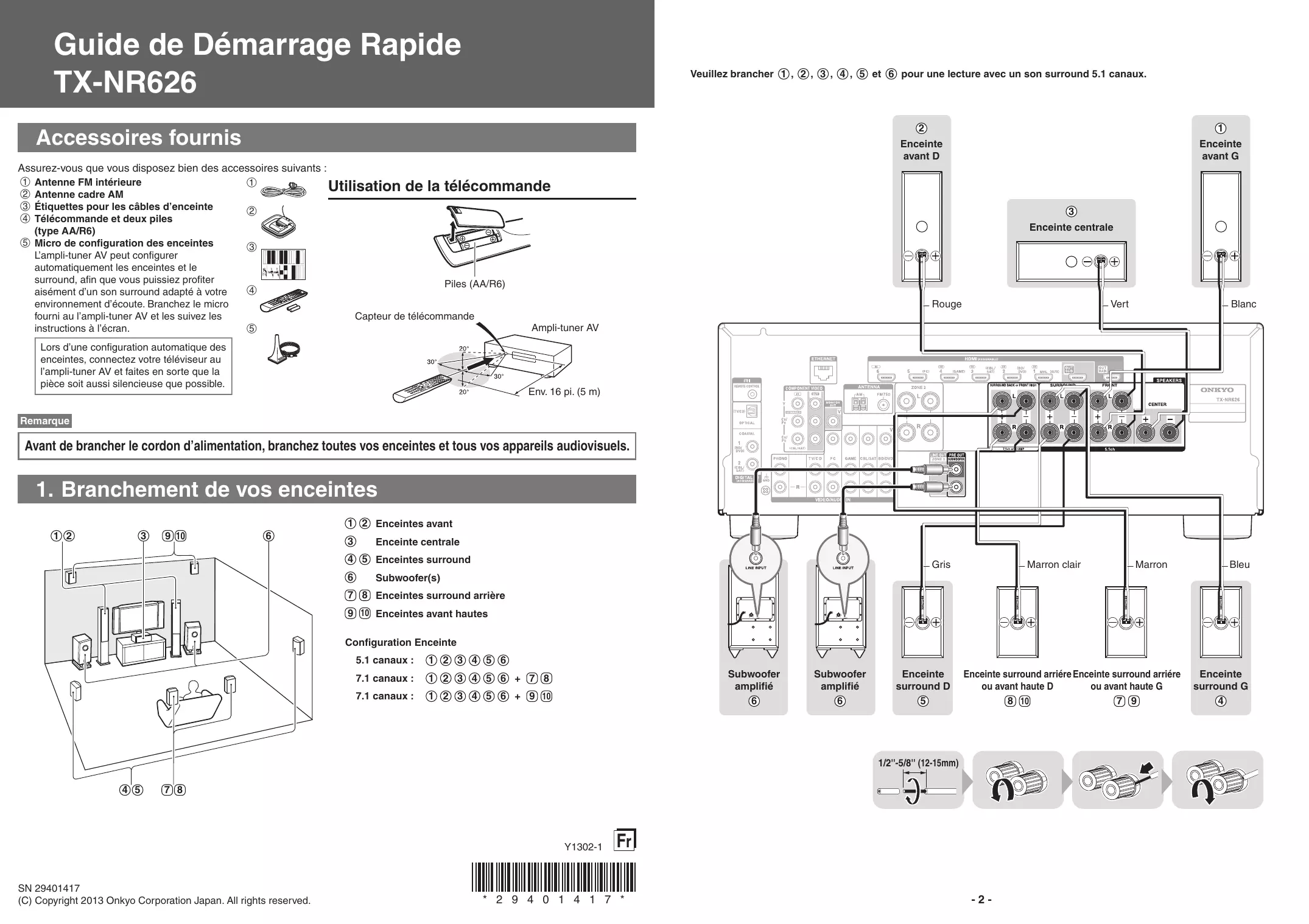 Guide de Démarrage Rapide TX-NR626 Veuillez brancher 1 , 2 , 3 , 4 , 5 et 6 pour une lecture avec un son surround 5.1 canaux. Accessoires fournis Assurez-vous que vous disposez bien des accessoires suivants :